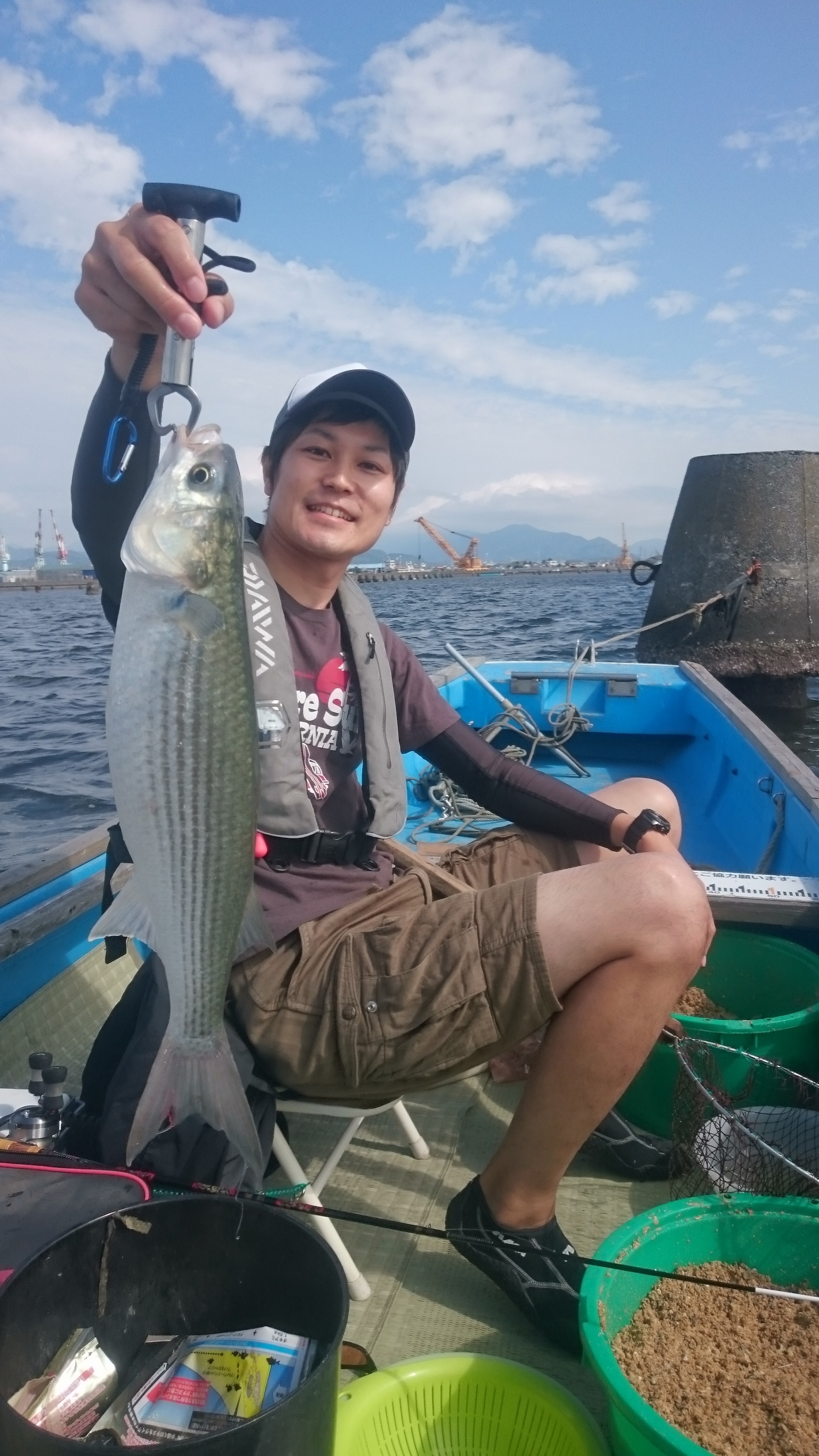当店スタッフの松本君がカセ釣りがマイブームということで、同行させてもらうことになりました。私は4年くらい前に三重県の筏釣りに1回体験したことがありましたが、今回のチヌ釣りは久しぶりでした。原金つり船さんで朝6時出船、ポイントは貯木場でした。ベースは1人2つお願いしました。ベース餌にチヌパワースペシャルMPを2/1袋を混ぜ、ダンゴを作りました。アンには活きさなぎミンチ激荒を、刺し餌にはオキアミ、モエビ、コーン、サナギなどを使いました。早速、餌にモエビを使いダンゴ投入!ボラが多いようで、落下している時にもつつかれているアタリがあるようでした。ファーストヒットはボラでした。グングン走り楽しい引きでしたが、針がすっぽ抜けバラシ、外す手間が省けました。続いて、本命ヒット!秋らしい小さめの22cmチヌでした。松本君も大きいボラを掛けていました。他にダンゴが中層で割れてしまうとアジがヒットしてきました。豆アジですが、良いお土産になります。今回の釣果は二人でチヌ3枚22~25cm、その他キビレ、ヘダイ、アジ6匹、ハゼ、ボラなど五目釣りを楽しめました。別の場所でやっていたお客さんは25枚も釣らていた方がいました。エサの選択、アタリの取り方など初心者にはなかなか難しいですが、晴れた日にのんびり釣りをするのは楽しいです。あとから聞くと、モエビを撒いて、アンにもモエビを使うとチヌがスイッチが入り釣り易いそうです。そういえば、4年前に筏に行った時にもこの話しを聞いたことがあったような気が・・・。次回はこの方法を試したいと思います。清水港のカセ釣りにハマりそうです。
