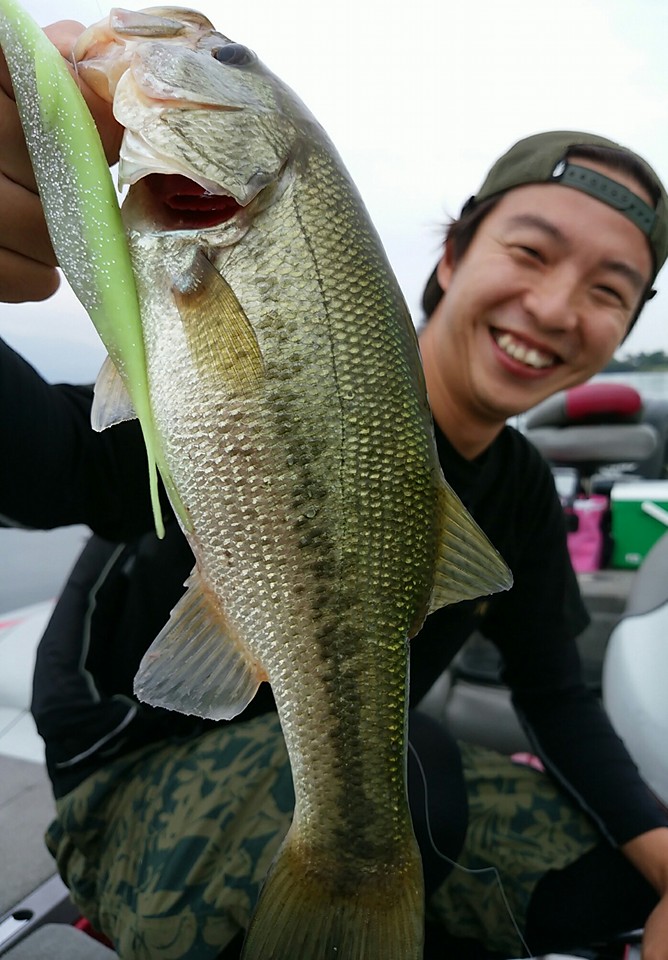 朝一なので表層系のルアーで反応をみることに!ローライトでベイトも多く、雰囲気も抜群!ライトリグを入れれば釣れることは分かっているのですが、今回は一匹釣るまでライトリグ禁止令を発動!少し苦戦しましたが、サカマタシャッドで35cmほどのバスを2連発!ライトリグを解禁しダウンショットを投入するとすぐに20~30㎝が釣れます!しかしサイズが伸びないのでシャローエリアに変更!水深50cm~1mのウィードが点在する場所で表層狙い!開始早々に54cmをゲット!続いて村上さんが56cmをゲット!日が昇った為、沖の漁礁狙いへ!ここでも30~35cmが連発!昼食を済ませ、夕方から再開!ネコリグやジグでウィードエッジや浚渫を狙うと20~40㎝が連発!暗くなるまで釣れ続き、おそらく2人で30匹くらいは釣ったと思います!これからが本番の秋のバス釣り!次は陸っぱりから狙ってみます!