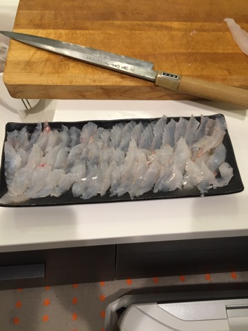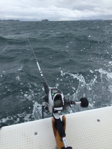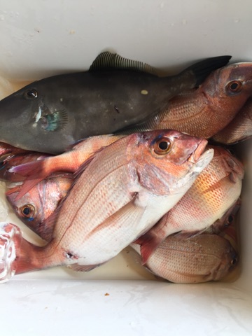 ウタセマダイが好調ということで、愛知店舗の釣りクラブで釣行予定をいていたのですが、台風16号が直撃で、断念か・・・と思っていたら、出船確認してみるとなんと出船できるとのことで、5:30集合6:00出船で集まりました。クラブメンバーは私を含め7名と一般のお客様が2名の台風にも負けない有志が揃いいざ出船!もちろん天気は穏やかではなく早アガリも予想できる状況ですので2時間勝負かなと考えながらタックルの準備を開始します。ポイントは神島の少し内側水深30m前後のポイントです、私の釣座は胴ノ間でしたのでオモリは40号を選び、仕掛けタテぎみでスタートします。一投目からアタリがあり送り込んで合わせると、真鯛らしくコンコンと首を振る感触が伝わってきます。30cm程のかわいいマダイですがこの天気の中、釣れてくれた本命に一安心です。海面は荒れていく一方ですので手返し良く仕掛けを投入し続け一気に10枚ほどかける事が出来ました。ポイント移動後も釣れ続けて2時間程釣りを楽しみましたがタイムアップ。風がきつくなり9:30に沖上がりとなりました。それでも25cm~35cm程の真鯛を18枚釣ることが出来ました。こんな天気の中出船して頂いた船長に感謝して。おいしくいただきました!これからが本番で連日大物も出ていますのでHPチェックして釣行してみて下さい。