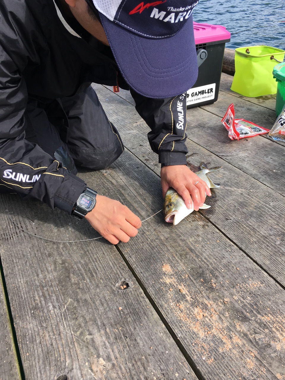 自身2年振り?に筏釣りに行ってきました。愛知のメンバー5名で筏に乗り楽しく釣りスタート。やや風があり、桶でダンゴを混ぜるだけで粉だらけに(泣)ようやくダンゴができ、周りの様子を伺うとオキアミがそのままでエサ取りもいない状況。しばらくして、お隣りのAさんにシオがヒット。本命ではありませんが、周りで釣れ始めそろそろ自分の番かなと思っていると何か居喰いしている気配…アワセてみるとかなりの重量感。これは違うと思いつつやり取りして上がってきたのはボラでした。筏の下には、時折イワシの大回遊もあり、鳥も騒がしくなっていました。青物や大型シーバス釣れているようなのでルアーで狙ってみるのも面白そうですよ。本命は釣れませんでしたが楽しい釣行でした。