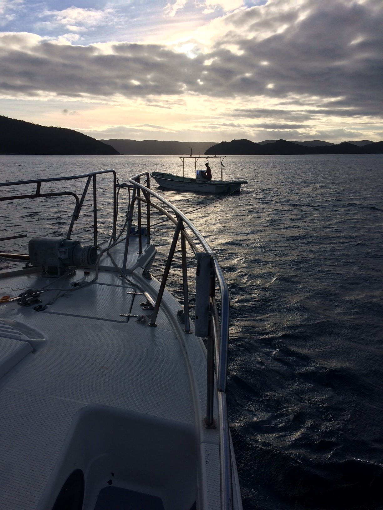 むかえた2日目、朝マズメのベストタイムに合わせて暗いうちに出船準備。一日のフルキャストに向け体調、気力も万全。薄明るくなるとともに出港です。アイドリングからの低速航行、期待が高まります。港を出ていざポイントに向け出発!スロットルを上げてこれからだ!というその瞬間に・・・。プスッ!!! ???あれっ?エンジンを掛け直すも掛からず・・・。港の目の前で漂流・・・。緊急用アンカーを下ろし、色々試しますが・・・。結局自力で港にも帰る事も出来ず、島の知り合いのダイバーの方に助けを呼び座間味島の港に帰港、結局この日は釣りをすることは出来ず、高速船で那覇に戻り、ちょこっと観光をして今回の釣行は終わりました。ハプニングもこれまた旅の楽しみのひとつ!?いい思い出です。(同行のGT初チャレンジのお客様には気の毒でしたが・・・。)懲りずにまた行きますよ!興味がある方は渡辺まで!