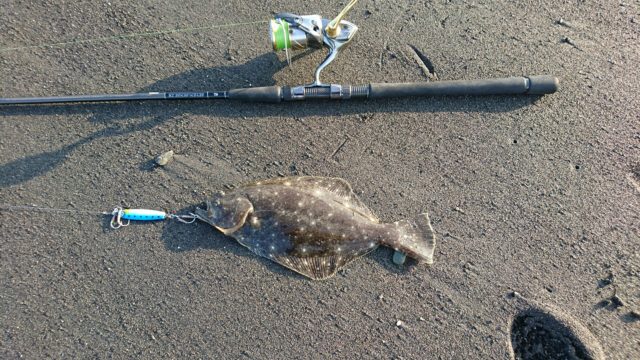 繰り返してしるとヒットしてヒラメをキャッチ出来ました、その後はアクアリザスターに変更して同じ様に底を取りながら巻いていると再びヒット!引き的にもそこそこ大きそうな