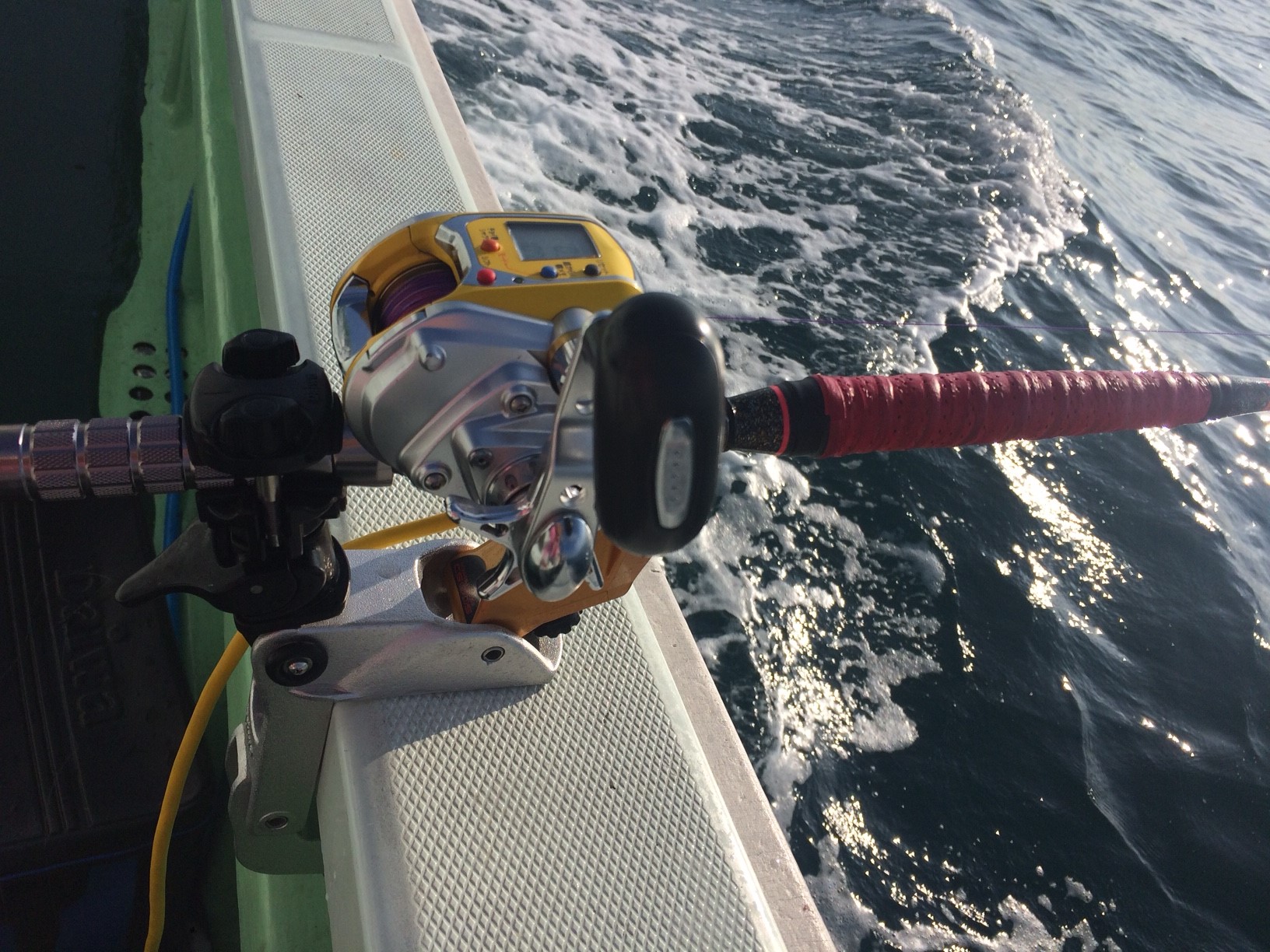 タチウオ釣りを釣りに行ってきました。静岡に住み始めて6年半、何回かルアーで狙った事はあるもののいつも貧果に終わり相性の悪いタチウオ、今回はエサで狙いに行ってきました。果たしてリベンジ成功なるか!?そんなに難しくないと思っているタチウオ、でも今回は違います。プレッシャーがあります。釣らねば釣具屋店員の面子がたちません。準備万端、実釣開始です。まずは港を出て5分焼津港前から攻めます。指示棚まで仕掛けを落とし電動リールを使いジワァ~ッと巻き上げながら誘います。アタリがありますが掛からず、エサを取られるだけ・・・。巻き上げ速度を調節し、仕掛けに手を加え釣り続けると・・・、皆に遅れを取りながらも釣れました、タチウオ。いつ見ても綺麗な魚ですね、顔は怖いけど・・・。しかし後が続かない・・・。全体的に渋いので安倍川沖にポイント移動し再開。ポツポツ釣れていましたが、明るくなるとだんだん渋くなりルアーの方が優勢に・・・。水深も深くなり、どんどん難しくなっていきます。しかし何故かこれが楽しい!!!数釣りも良いですが「どうやったらやっつけれるのだろう・・・。」と考えながらやっているとあっという間に時間が過ぎます。で、時間は掛かりましたがこの日のヒットパターンを何となく見つけることができ、そこそこの釣果を出す事ができました。最終的には29匹。サイズは指3本サイズがほとんどしたが2匹だけ指4本サイズが混じり満足釣行となりました。今回はエサ釣りのみに絞りましたが、ルアーもやることが出来ますし、タチウオテンヤでは大型が釣れているので今度はタチウオテンヤ、挑戦してみます。