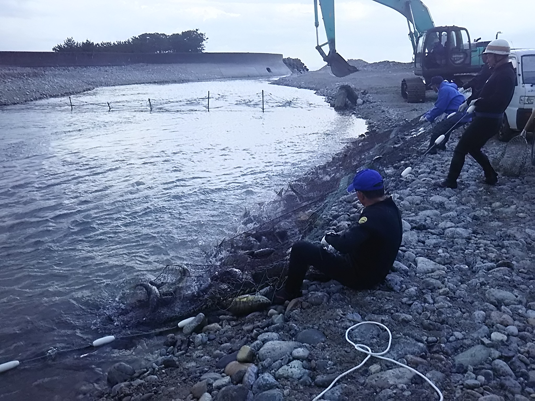 現地に着いたのは午前8時。ちょう漁協の方が網を入れているところだったのでそれを見学。無数にサケはいます。受付まで朝ご飯を食べてゆっくり過ごし、10時過ぎに受付。釣り開始は11時からでしたが、釣っていい場所が広くなかったため、先行者がいなくなるのを待つことに。しかし、30分くらいして天気が急変!!雨脚が強くなってきました。急いで竿をだして、2流し目に銀ピカできれいなメス!!ここで暴風の為、竿を持っていられなくなり休憩・・・一時間くらいして釣り再開。風も雨も強いがちゃんと底付近を流していくと必ずサケが釣れる状況☆メス6匹含む9匹釣る事が出来ました!!貴重な体験ができました。来年は10kgオーバーを狙いに行きます!!