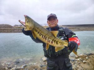 開始早々私にヒット!!思っていた以上のサケのパワフルな引き、寄せては走られなんとか1匹目を釣り上げる事に成功。