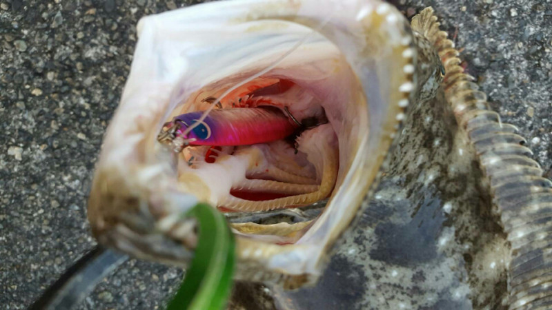 近くで釣りしていた箸元さんはリジェット40gで50ちょっとのヒラメを釣っていました、リジェットを丸のみでした。