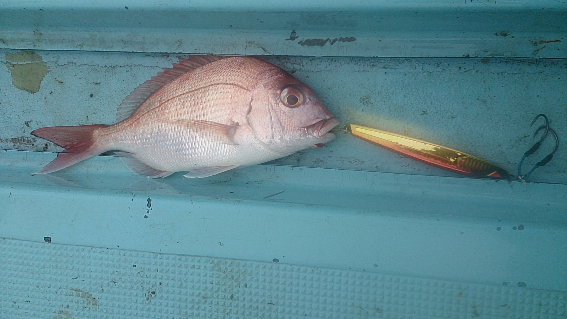 この日の二日前にワラサ、喧嘩ブリが上がり出したため、一緒に釣りに行く人は良い想像ばかり描いたのですが、、昨日と打って変わっての雨でした、みんなでレインウェアーを着て、先ずはきのう良く釣れたポイントへ。到着すると船長の様子が少しおかしい?とりあえずジグは落としてみるが、魚の反応は全く無しでした。ポイントも点々とかわりますが魚は釣れずヤバイ感じ。その時、強丸から無線が入りフェリー航路へ走ると一投目から後ろで竿を出していたメンバーが青物を掛け魚はいるのが分かったため自分もベイトロッドに持ち替えあいや~じぐ 185g グローヘッド 底から只のワンピッチで7,8回シャクったあたりでゴンゴンとワラサの独特のアタリで、リーリング中に首を左右に振るというサインがロッド伝わってきました。ドラグもたまに出された位でしたが77cmの丸々したワラサをネットですくって頂きました。なんとその日は船中ワラサ2本、マダイ1、タチウオ数本、ホウボウ1でした。