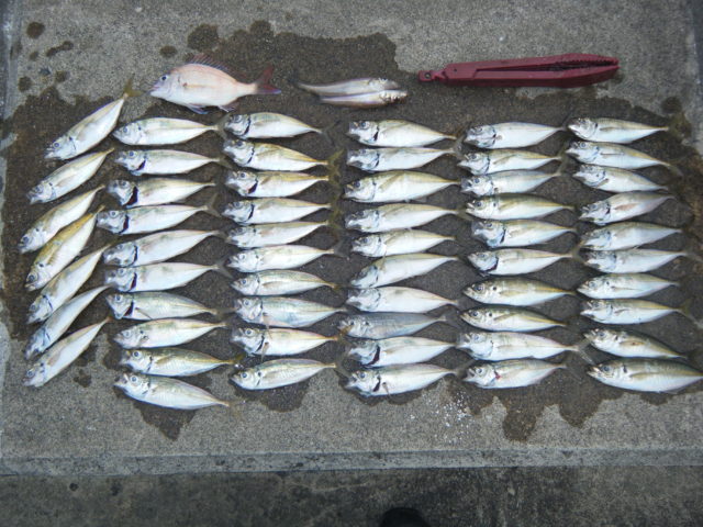船での釣果が思わしくなかったので せめてアジだけでも と鳥羽に行って来ました。仕事終わりからそのまま釣り場に向かいポイントにエントリー、しかしポロポロと釣れて後が続かない。群れが居ないのか自分が外しているだけなのか?色々試すがポツリポツリと釣れる程度、同じ場所でやっていれば回遊があると思われるがココは場所移動。次の場所には先行者1名、一番いい場所を押さえられているのでその周囲を探ると居ました!手前に群れが居て沖目は魚が散らばっている感じ、キャスト後は毎回レンジをランダムに変更しつつラストの群れにはレンジを合わせる(勝手に合います)作戦でアジを追加。手前でナイスな魚が掛かるが姿を見せずラインブレイク、途中からアジの群れがばらけて狙いにくくなったので元の場所に戻ることにする。移動してすぐにアジが釣れ明け方の追い込み!釣れるのだがライントラブルが連発…なぜだか原因は不明だが弱い向かい風の影響だと思われます。そして魚は不明だがラインをブチ切っていかれる、それもラインローラーのところからパチッ(泣)空が明るくなりかけてもアジが反応して8時少し前まで釣れ終わってみればアジ56匹となってました。移動した先からもう少し早く戻れば釣果が上がったのではなかろうか・・・それとライントラブル・・・
