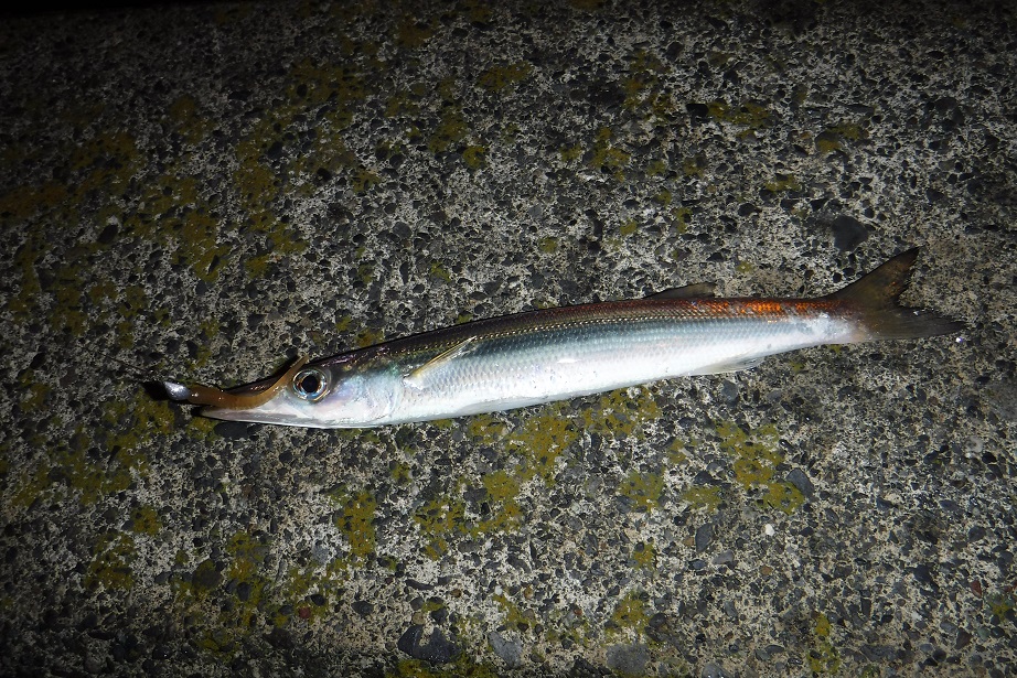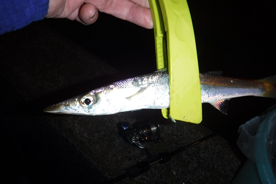 まずオクトパスの夜光ワームから釣り開始。しかし、前回同様カマスは見え、ルアーを追尾してくるもののなかなかヒットしません。少しずつレンジを落として探るとようやく一尾めをゲットしたのが30分後でした。ここでルアーをフッシュライクに交換。これで3連発ヒットします。早々に最後のキメラベイトのケイムラに交換しますが、ここからまたアタリが渋くなり、40分で一尾追加ました。もう一度オクトパスに替え、二尾追加、良型のメバルも混じったところで納竿としました。されどカマス、ワームセレクトにはカラーや形、長さも十分に考慮した方が良さそうです。