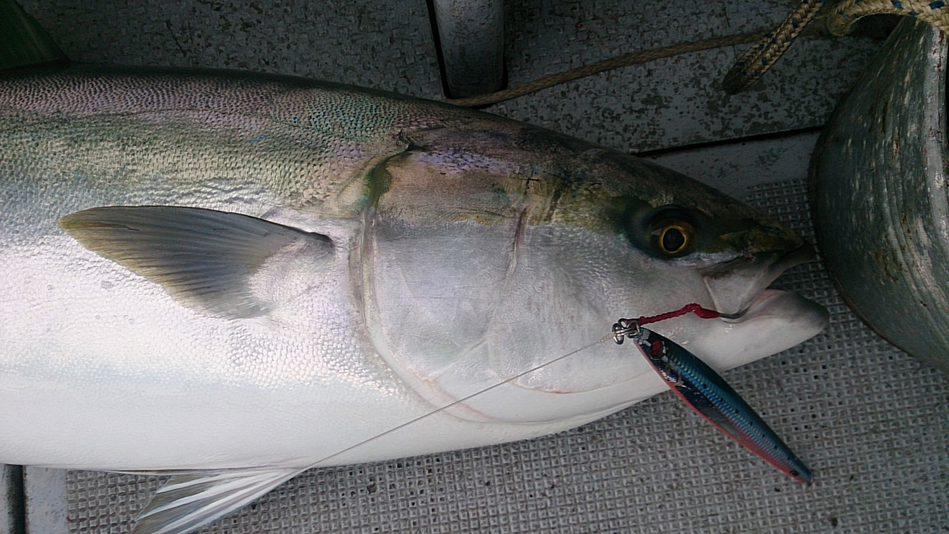 今回の釣り座決めて船に乗り込み、いざ、ブリポイントへ到着して3回ほどシャクった時にアタリが有ったのですがハリが掛らずもう一度落とすとゴンゴンとライトタックルにワラサがヒット!連鎖して隣の人にもヒット。そのポイントではワラサ合計3本上がりました。反応が無くなりポイントを点々としてお魚を探していた時、無線が入ったのか北の方へ一気に何隻も最高スピードで走り出し前の人は水をかぶるほど(20分)到着後、船団にはまだなっていない、皆もテンション上がりジグを落とすと一回目の落としで3人がヒットしロッドが曲がるが自分にはアタリ無し、3本上がりもう一度さっきのポイントに船を戻すと一回目から私にも来ました。けど初めから凄い引きでドラグがジージー出て気持ち良い!(船長がゴリ巻きして早く底から離してと一言)同時にヒットした3人は全員ランディングは終了し残るは自分一人となりました、焦らず落ち着いて何度も糸を出されましたが20分ほどのファイトで水面に顔を表したのは巨大な鰤でした!船長も驚きデカ鰤をランディングしてから、やりましたね~小林さんと周りの方に言われました。釣れた魚は100cm、10.72kgの文句なしの鰤でした、ヒットしたジグは剣屋の一撤200gブルピンでした。その後も周りでは7、8kgサイズは出るものの10kgを越える魚は出ませんでした。