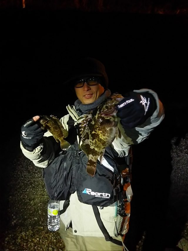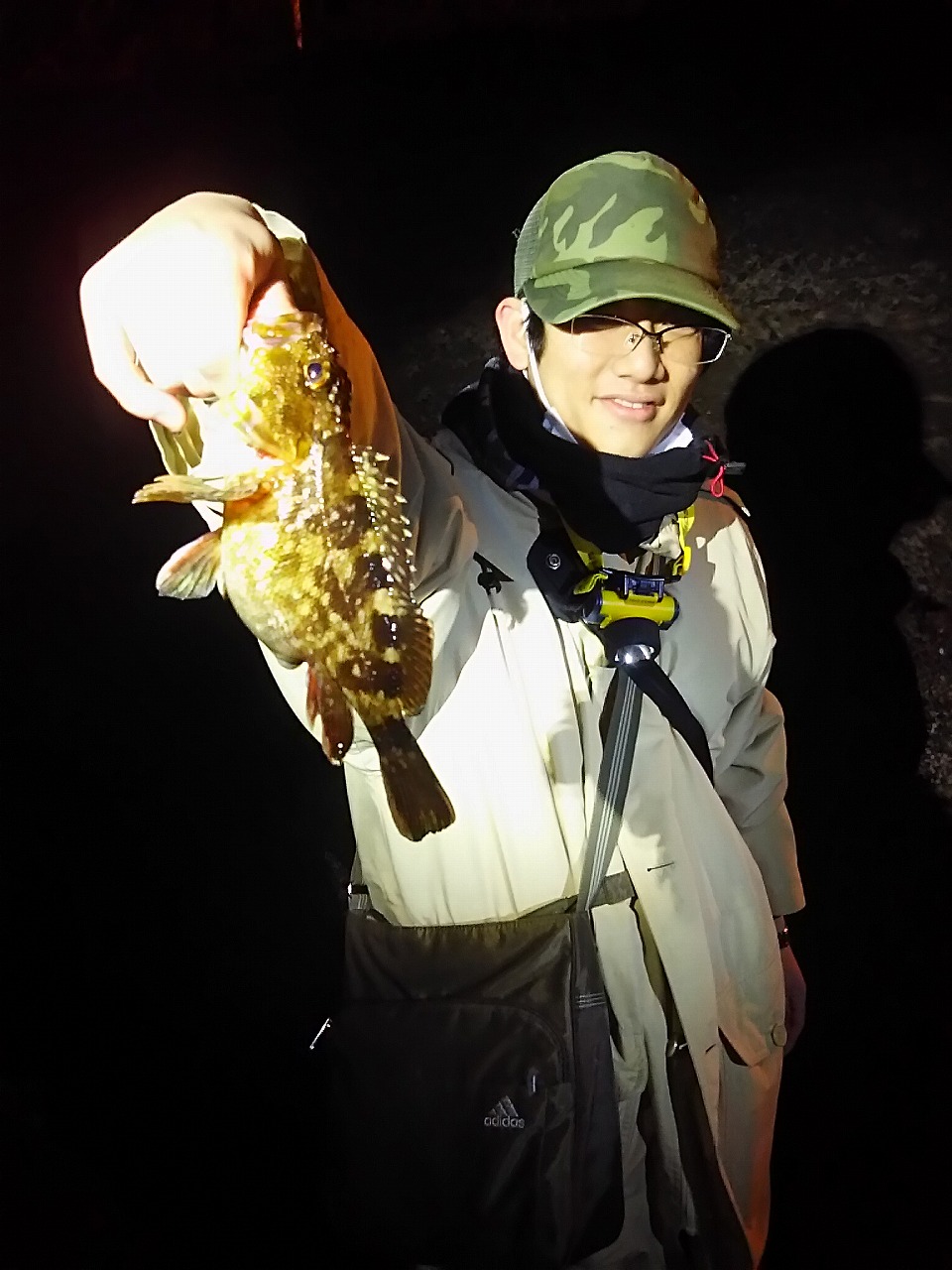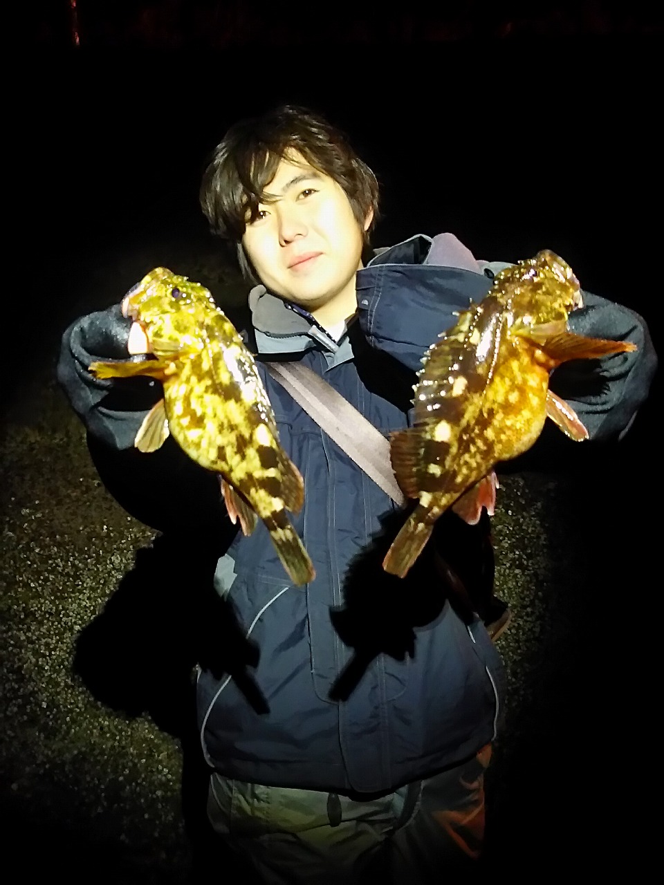 まずはチヌヘッド+海毛虫(オレンジ)で石積みのあるポイントを丁寧に探っていくと10cmほどの小型のカサゴが釣れました。「これじゃないいんだなー」と思いながら投げ続けるもアタリは少ない・・・ベイトパターンが違うか??ホッグ系のワームにチェンジすると1投目で良型のカサゴ!!3投目に良型のタケノコメバル!!!パターンは見つけた☆みんなにパターンを伝えるとポンポンと数を伸ばします。しかし、向かい風が出てきて濁りが入ると途端に食いが悪くなり、アタリがあってものらない状況。結局、時合は1時間もなく終了。しかし、パターンと魚がいる事は確認できたので次回はもっと大漁を目指します。