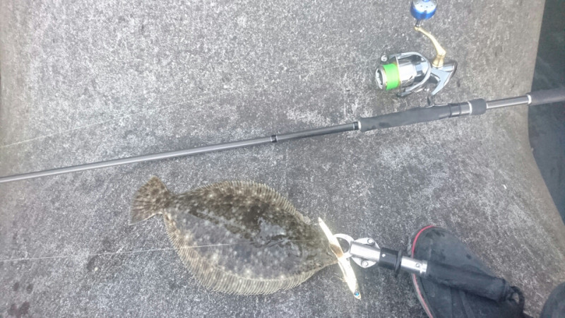 潮止まり一時間前あたりにマズメが重なっていたので期待していましたが、全くあたりなし、帰ろうかと思いましたが、潮が本当にとまる直前も時合いは凄く短いですが特にヒラメは強烈に活性が上がる事が多々あるので完全に潮がとまるまで粘ってみることに、、、、やはり日は完全に昇っていますが潮がとまる寸前で40cm位ですがアクアリザスターのゴールドメッキでヒット。その後も急いで投げているとヒット、サイズアップして50cm位のをキャッチ、その後はアクアリザスターの引き抵抗もスカスカしてきて潮がとまったと思い終了しました。