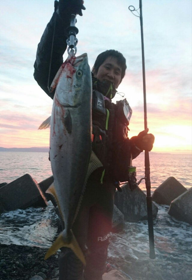 朝、日の出頃にかっ飛び棒にヒットして81cmのワラサをキャッチ出来ました、かっ飛び棒は最初底を取りゆっくり巻きでのヒットでした、自分の今年のサーフの第一号の魚だったのでフィットさんに手持ちの記念写真も撮ってもらいました。 周りもポツポツ上がっており、今年サーフ初釣行は良いスタートをきれました。