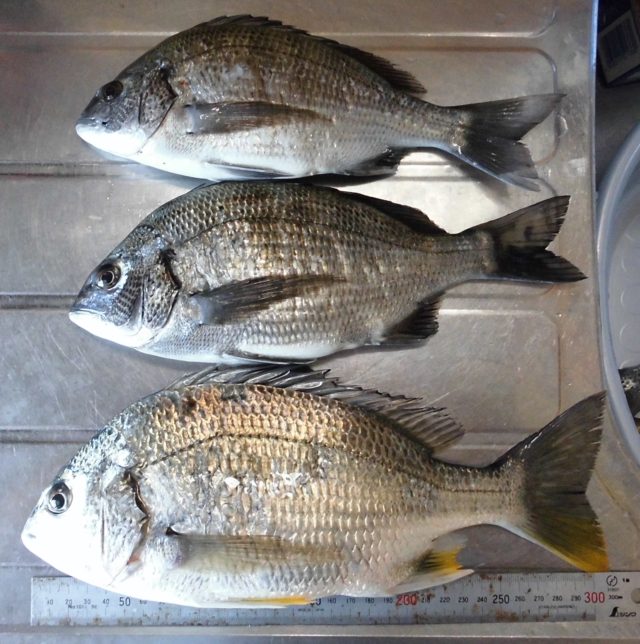 休みの加減で尾鷲釣行です。仕事終わりから走り釣り場にはAM2時着、急いでポイントにエントリーしてすぐ1匹ヒラセイゴが顔を出す。問題はココから、次のアタリが ウン~~~ と押さえ込んでアワセ!で抜けたー。少ししてもう一度 押さえ込んだー—アワセ!抜けた~ マジか、また少しして押さえた!—–ヒット!ジッジッスカッ抜けた~(泣)でも魚がわかった!絶対にチビクロだ。次は捕る!そして押さえた、竿を立て気味でテンションを~ヒット!ジィジィジィ—–上がって来たのはやはりチビクロでした。誘いをボトムバンプにかえて コッ ヒット!チビクロ2枚目これでアタリが止まり場所移動してみるがどうもよろしくない。ここでもボトムバンプに誘いを切り替えると足元で コッ ラインスラッグが出ているが迷わずアワセにいくとロッドが突っ込む!ドラグを出されるがライン0.2号のPEは強度抜群!キビレゲット。ヒラセイゴも追加して夜明けにて終了。昼間の釣りでは投げサビキでデカコノシロとボラをゲット、夕暮れまで休憩して二晩目の入りは全然ダメで場所移動。移動しても渋い状況はかわらずリグって数少ないアタリを全て捕る勢いで頑張りセイゴをボチボチ追加して尾鷲釣行は終了です。キビレ31㌢チビクロ26㌢と27㌢、コノシロ32㌢セイゴ2種最大35㌢までが10匹でした。
