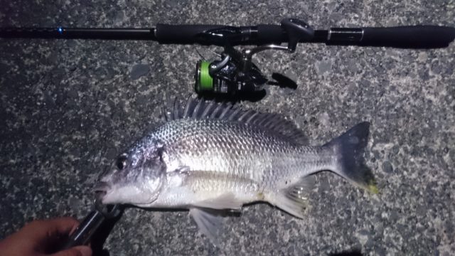 仕事帰りに港に寄ってきました。タックルは9フィートシーバスタックルにルアーはいつものO.S.Pドライブクロー2インチを使いました。最初に堤防のヘチに落とし込んで行くとミニカサゴが釣れました。今度は沖目にキャストしてボトムをゆっくりただ巻きしてくると底質がカキ殻では無く砂地をズルズルと感じて良い感触。っと思っているとゴンゴンゴン!ん!?ゴンゴン!これは久しぶりのあの魚のアタリ!しかも引きが強い!強引に引き寄せて見えた魚体はキビレでした。せーの!でゴボウ抜きです。デカイ!40cmジャスト!今季最大サイズのキビレでした。写真を取ってリリース。4月中旬からぱったり釣れなかったキビレが釣れました。嬉しい気持ちを押さえてズル引きしていると、違うコースでまたアタリ!!今度は繊細なコンコン!マゴチです。小さかったので外れる前に一気にゴボウ抜きです。サイズは42cm、写真を撮ってリリース。中潮の下げ止まり直前に爆発です。30分くらいの釣行時間の間にカサゴ、キビレ、マゴチが釣れ大満足で納竿しました。この1週間の潮周りが大チャンスです!