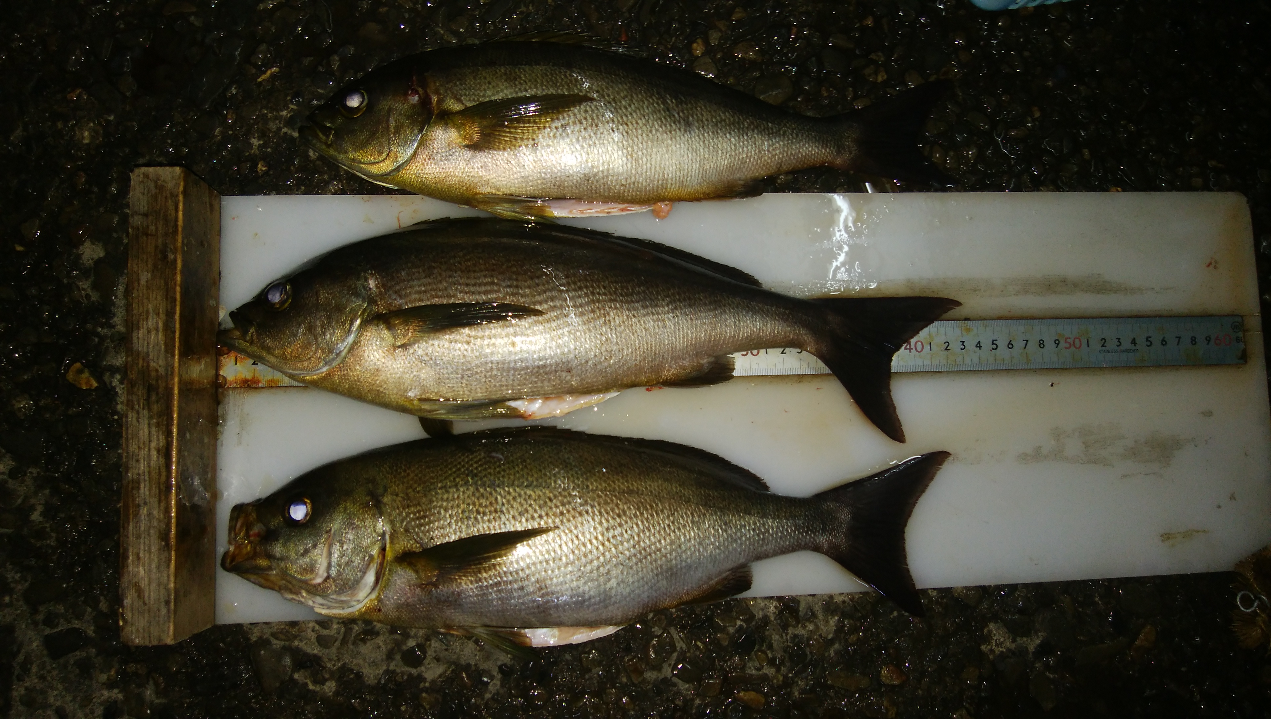 久々の通し釣りです!紀伊長島に行ってきました!午前便は、大島裏のナナシ!以前に良い思いをした磯です!最近の調子も良いと言うことで期待大です!少し波気もあり雰囲気は良い!午前便の結果は・・・。グレボーズ・・・。サンノジ・アイゴのオンパレード・・・。しかもデカイ・・・。合計20枚ほど・・・。よ~引く魚に遊んでもらいました!そして午後便は、大島1番に!夕方の時合待ちです!潮も早く・・・釣りにくい・・・。しかも上潮だけ早いので仕掛けが入りにくく・・・。16:30で・・・ベラ1匹・・・。これはマズイ・・・。相変わらずぶっ飛んだ潮・・・。流し切ったると思いガンガンラインを出していくとバチバチ!!!気持ちの良いアタリが!上がってきたのは40cmオーバーの良型イサキ!続けてイサキ2匹・グレを追加!そして・・・サラシ際でウキがズキュ~~ン!!バチバチ~~!加速が半端無く・・・一気に沖にガッガガっと持って行かれ止めれず・・・ラインブレイク・・・。去年も同じポイントで同じような引きの魚にやられたのを思い出しました・・・。悔しい・・・。それでも釣果としては、グレ37cm・イサキ40~43cm・3匹と楽しめた釣行となりました!強烈な引きが味わえる半夜釣りはやっぱり最高です!!