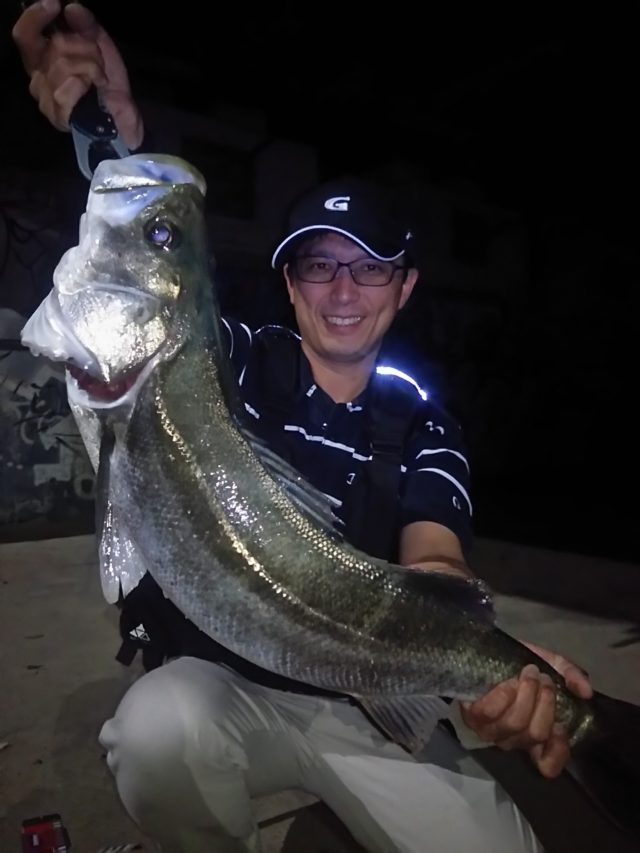 帰ろうと思ったがやはりボイルが気になるので東君のタックルでちょっと投げさしてもらう事に。ムカイの『モンキーロックバイブ』をフルキャスト(他人の竿で)してようやくボイル付近までとどく。一投目はただ巻きで確認。何かいる気配はします。二投目は着水後、糸ふけを取ってダートを入れると2回目のダートでゴン!!と同時にドラグがどんどん出されていきます。「ボラだボラ~」とか言いながらも、慎重にファイト。上がって来たのは75cmのいいプロポーションのシーバス!!東君にすくってもらい無事ランディング!!東君の竿で東君のリールで東君のタモで・・・嬉しいながらも心底喜べないランカー捕獲でした・・・が、とりあえず満足しました(笑)