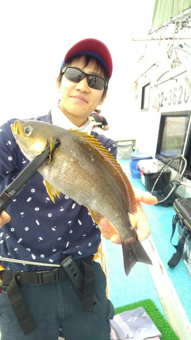 港から1時間20分でポイントに到着し、早速やってみます。しかし、全くアタリがありません。仕掛け変更です。3本針のからばり仕掛けでやってみます。オキアミを付けていざ投入!すると、グッとアタリがありました!ゆっくりとあわせると、グーッと引き込んでいきます。早く巻き取りたいところですが、イサキはバレやすいと聞いたので、ゆっくりと巻きます。水面まで仕掛けが来たところで、仕掛けをたぐり寄せます。ついに!イサキの姿が見えました!慌てずタモですくいます。上がって来たのは28cmと小ぶりでしたが、これでコツをつかみました!このまま順調に釣りたいところでしたが、潮が悪く、激シブでした。そんな中でも工夫しながら釣りをした結果、16匹釣ることができました!