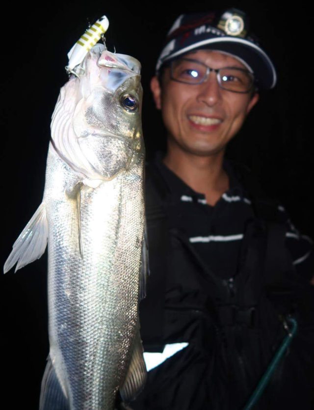釣り開始早々には私に50cm弱のシーバス!!もちろんオリカラのtenラインプレミアムゴールドパール!!橋脚の際を高速巻きで見せてからクワセのショートピッチのリフト&フォールで攻めると狙い通りにゴン☆と、きました。干潮に近づくにつれベイトの層も圧縮されてきたのか、ボイルは起きないものの、35cm~40cmまでがポツポツ釣れます。20cm以下の小型も多いため当たるけど乗らない・・・そんな中チームロンジンの太田氏が良型のクロダイを釣り上げました・・・オリカラではありませんでしたが・・・