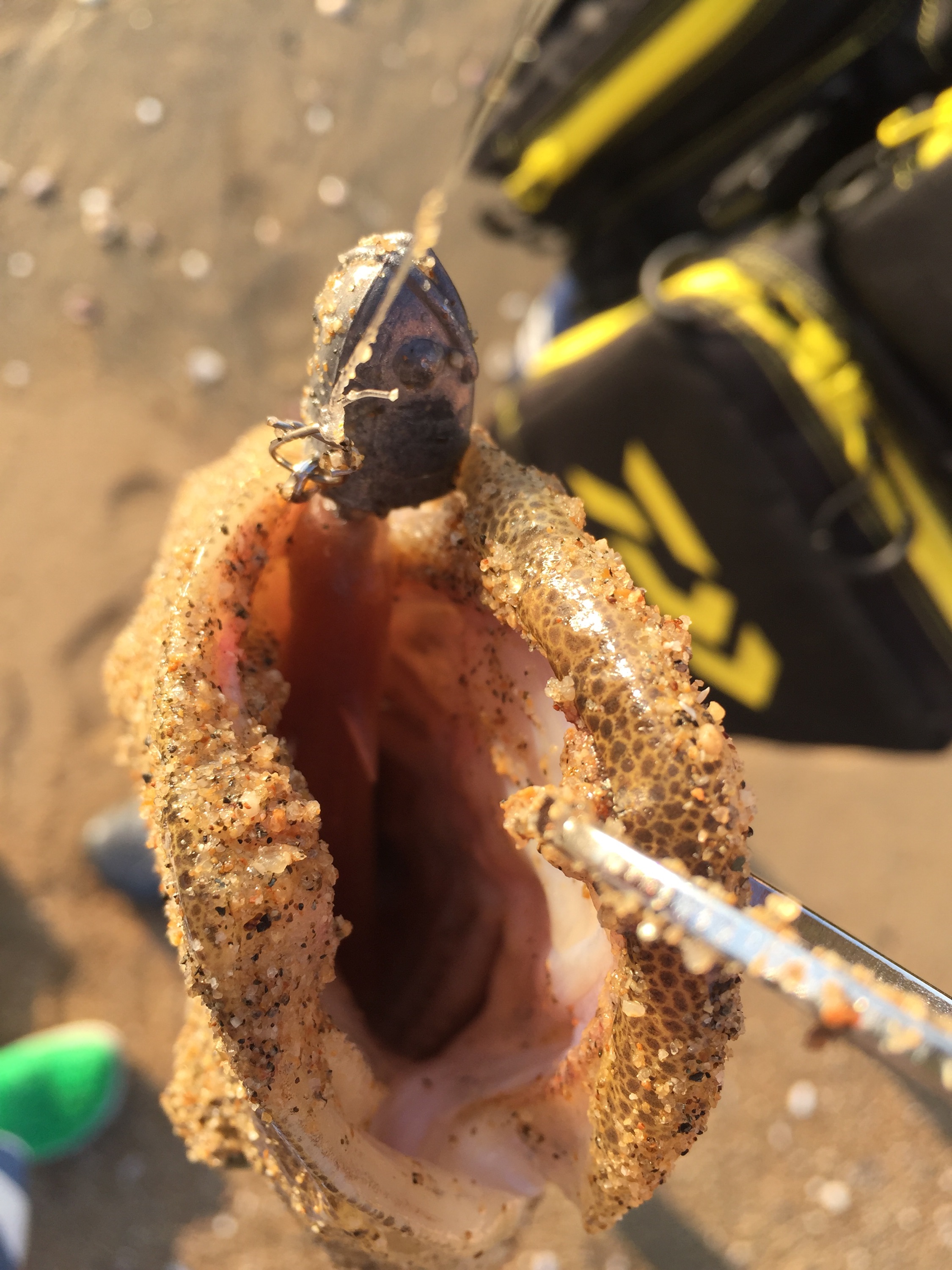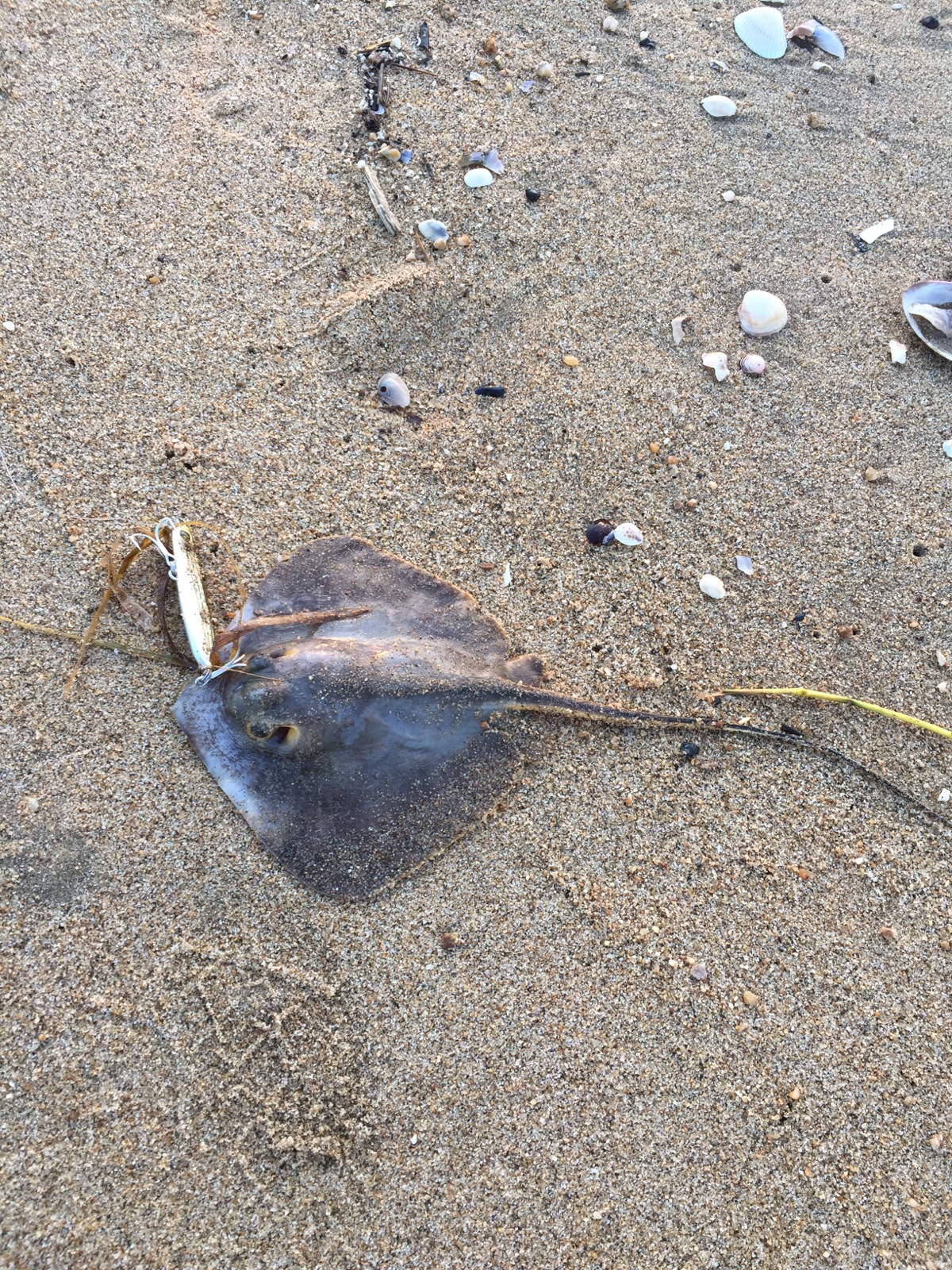 地元の方にポイントの特徴を聞くとブレイクはかなり沖とのこと。それ聞き、とりあえずスピンビーム32gで様子見。すると何投かで反応が!フッキングまではいきませんでしたが、魚がいることがわかるとその後はとにかく遠投し5巻きほどしたらまたボトムに落としながら狙っていきます。その後すぐ何かがヒット!ランディングしたのはまたもエイ...嫌な予感がします(笑)