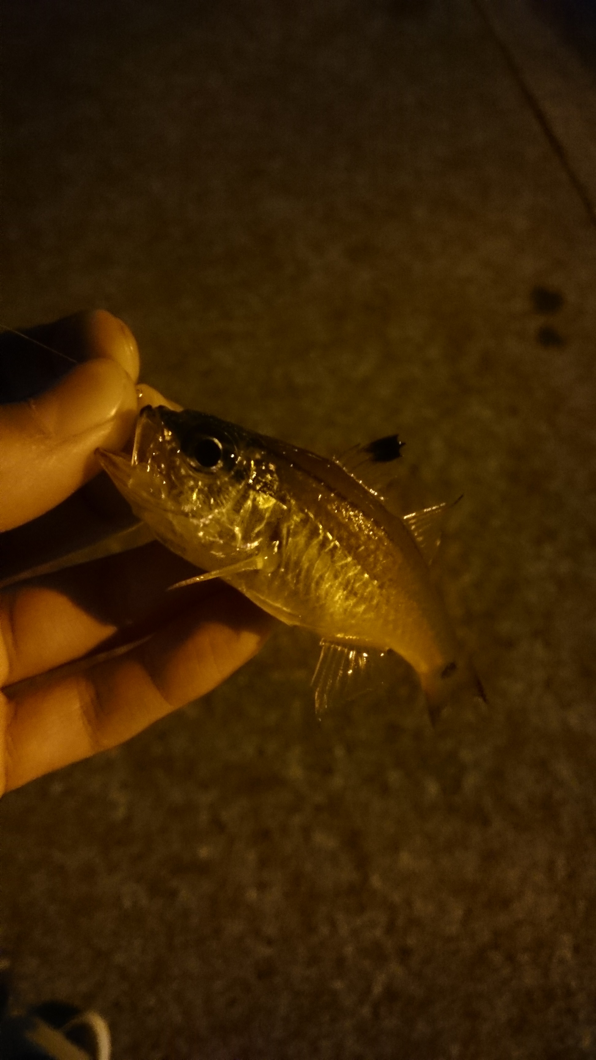 仕事帰りに焼津港に行って来ました。ルアーはアジスタSS-0.4gに34のジュニアをセット。常夜灯付近でカウント10からちょんちょんシェイクしてさびくやり方です。向かい風でゴミが打ち寄せられており、ベイトが溜まってそうな雰囲気です。すると、1投目からヒット!ネンブツダイかと思ったら、横に走る!!上げると本命のアジでした。写真を撮って、投げ直しますがこの1匹だけでした。久しぶりのアジに興奮しました。その後も少し粘りましたが、ネンブツダイを数匹追加して納竿しました。