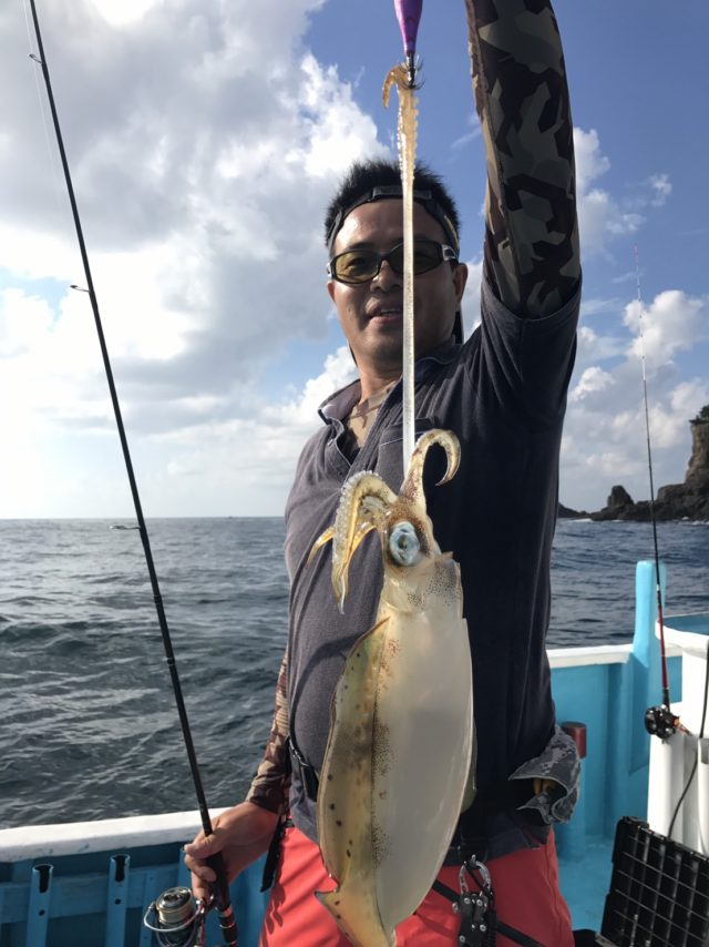 着底して3~5回のシャクリを入れてからステイ、するとティップが戻るアタリ、ティップを引き込むアタリ、もぞもぞと揺らすアタリなど様々なアタリを堪能する事が出来ました。この日の朝は長めのステイも有効で5秒くらいしてからあたることも。船長曰く、長い時は10秒くらいであたる時もあるそうです。また船が動かない時間帯はキャストして周囲を探ると良型500g以上があたるこがありました。この日はウネリでアタリをとりにくいですがポツポツと拾い釣りができ、たまに連ちゃんモードもあり、数釣りが満喫できました。エギはダイワのエメラルダスボートⅡのピンクイエロー杉でなかなか良い結果がでました。船長も親切丁寧に教えてくれますので初めての方でも安心して釣行できますよ。