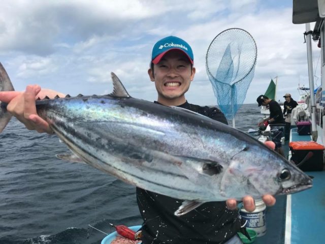 出船から2時間ほど沖に向けて走るもなかなかキハダに遭遇できず、船団もまばらな中、カツオの群れでお土産確保からスタート。なんとタナは5m!水中にビシが見えるところでコマセを振るとすぐにカツオが船下に集まってきました。1キロ前後の小ぶりなカツオが釣れ、3mのハリスでも長いくらいでした(笑)