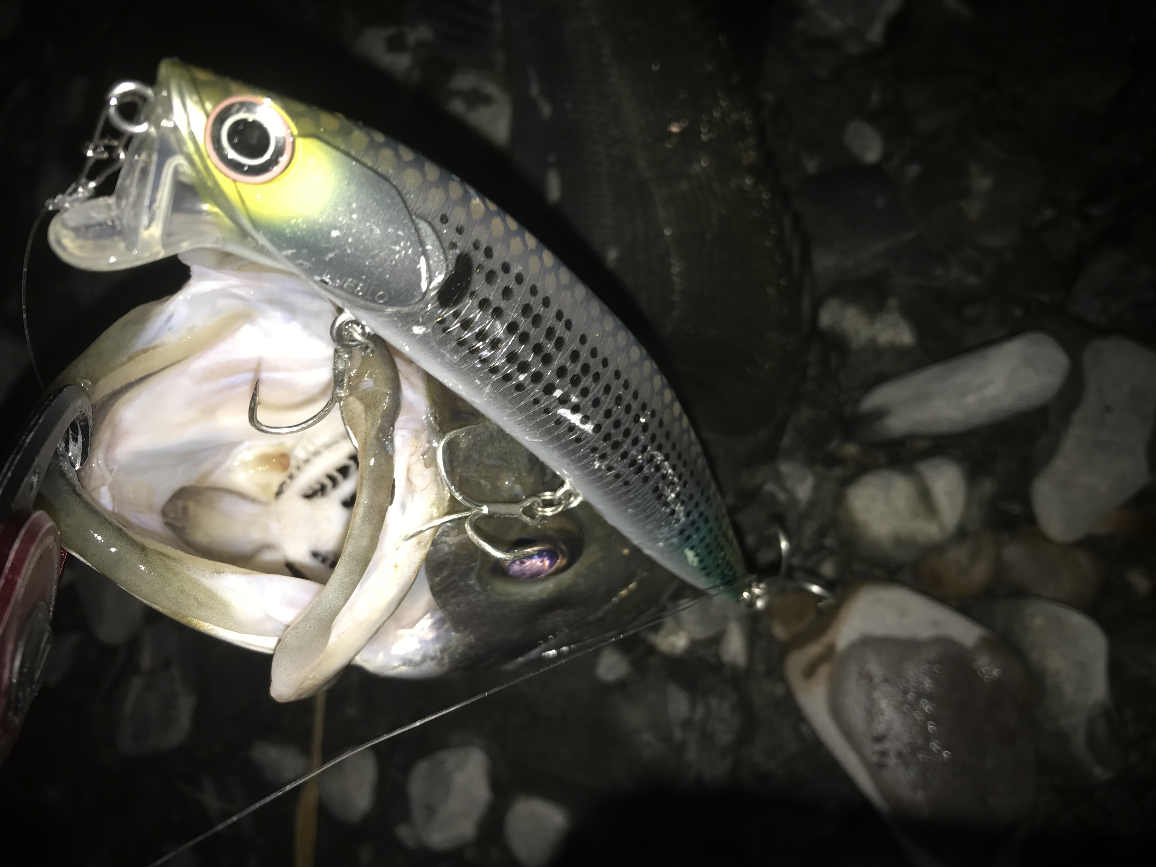 本格的に暗くなってからロンジン ウェイキーブーを投入して少したってからいきなり大きな捕食音と共に大きく竿がブチ曲がります!!