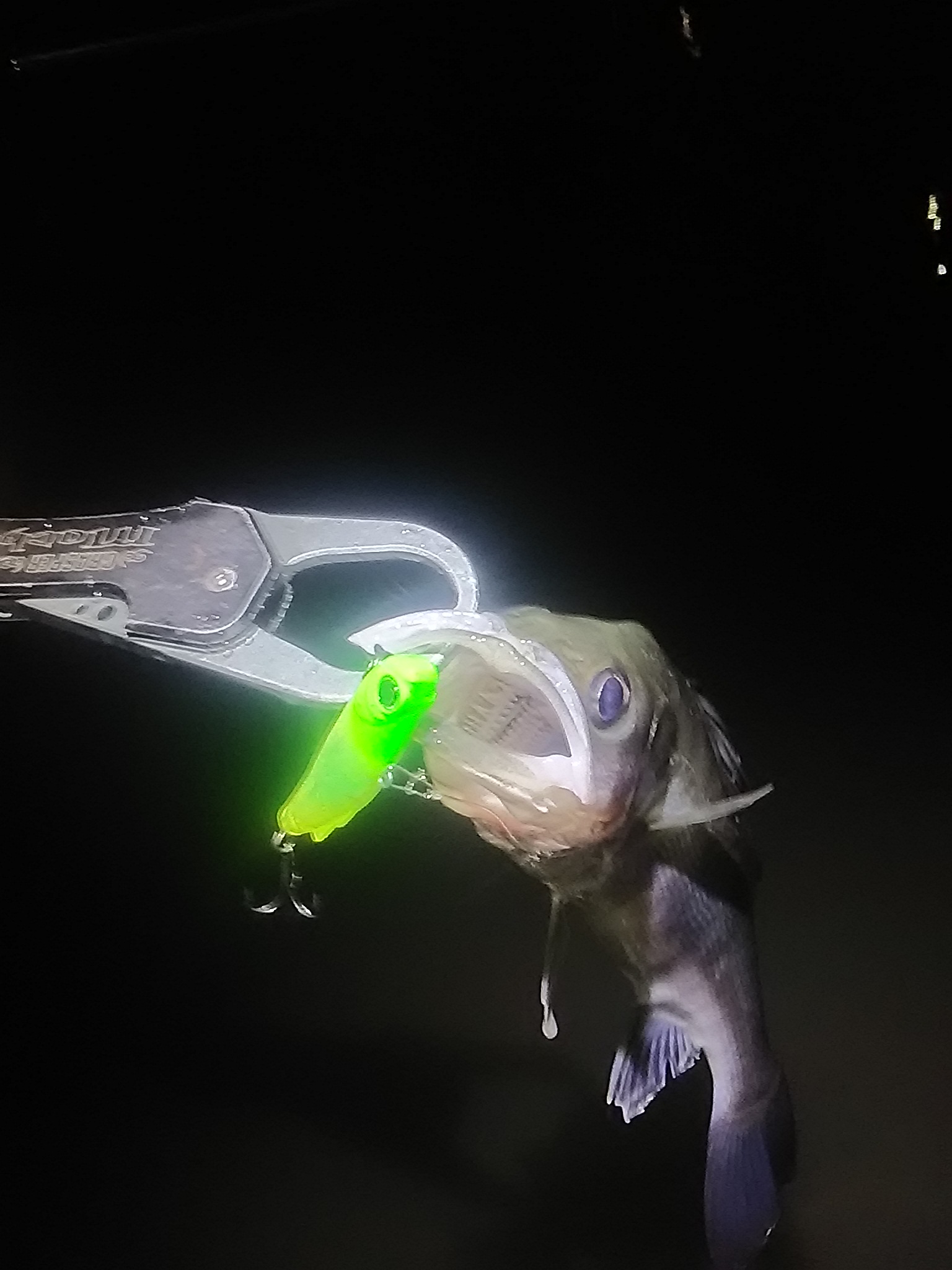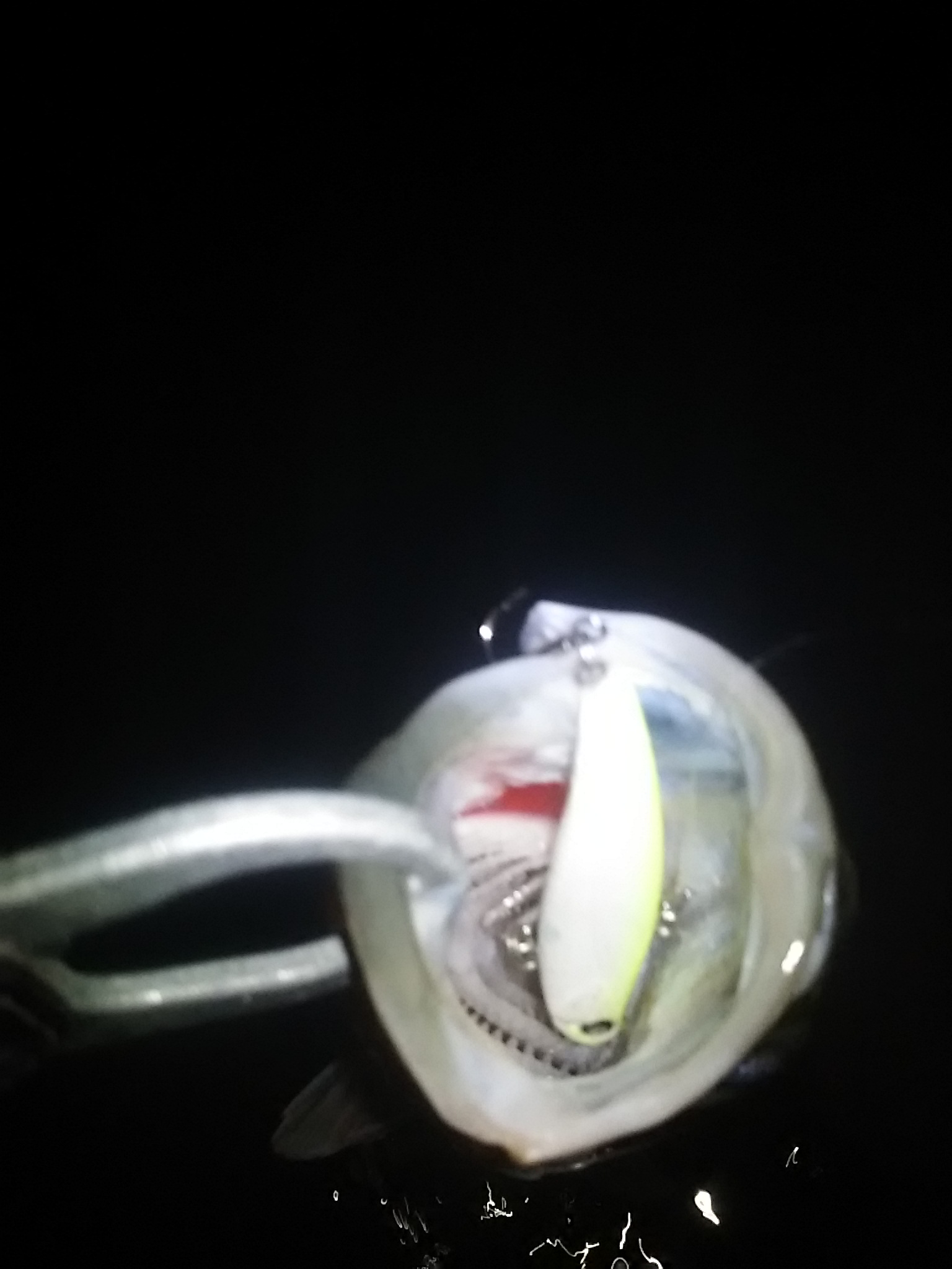先行者はいたもののちょうど釣りをやめるタイミングでポイントを開けてもらいました。ポイントを休める意味も込めて、30分ほど水面を見ていてもボイルやベイトが追われている様子はありません。表層から攻めるのにまずはDUOの『マニックフィッシュ99』を流し込んでいきますが反応ナシ・・・続いてロンジンの『レビン』で少しレンジを下げるも反応を得られません。次にダイワの『ミニエント遊オリカラ』を投げるも早巻きでは無反応・・・少し竿を上下に動かしながら短いピッチでアクションを入れるとようやく何かがさわってきた感じ・・・もっとスローに・・・ボトム付近を同じ感じでゆっくりドリフトさせていくとゴン!!30cmくらいでしたが元気なシーバスが釣れてくれました!!同じ感じで5連続HIT!!全てミニエント遊オリカラ!!ポイントを30分 ほど休めてもう一度入り直すと予想通り!!またまた連荘!!ミニエントで反応が無くなるとロンジン『キックビート12g』に変えて強波動で誘うとドン!!それでも喰わなくなったら『モンキーロ69バイブ』で遠投するとドン!!30cm~60cmまでをかなりたくさん釣りました。(途中から数えるのをやめました)