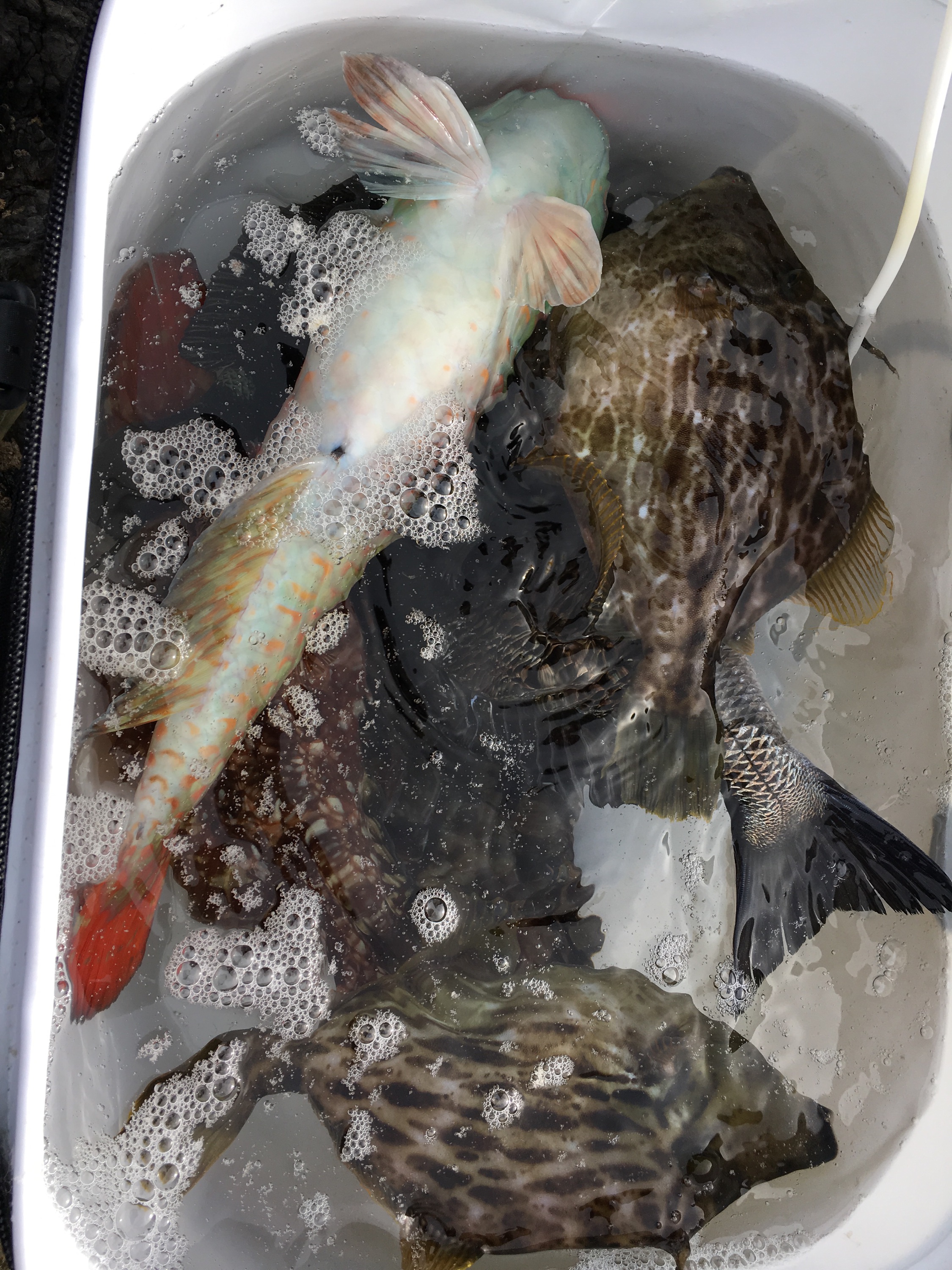 偶然に磯際に良い感じにシモった途端にウキが消えHit!! 頑張ってファイトし上がってきたのは35cmあるなしのグレ! その後も25cm程のグレがポツポツ上がってくれました!時合が過ぎるとフグ・カワハギ・イガミ・アイゴ・黒鯛など五目釣り状態に・・・・