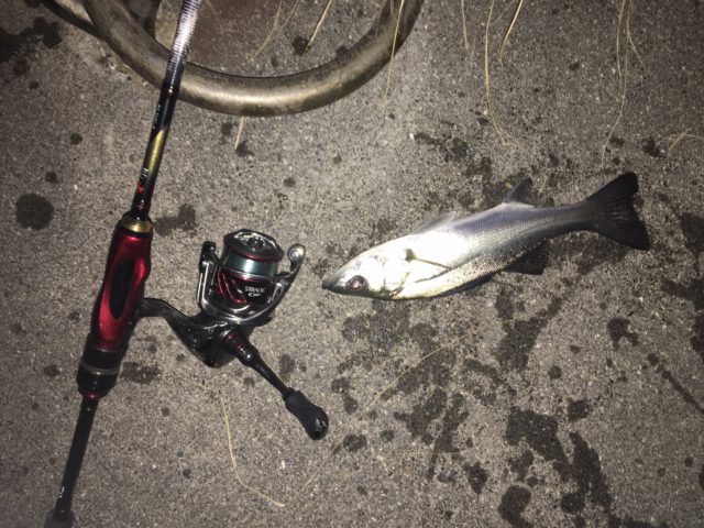 しかし相変わらずアタリが無く、腕が悪いのは場が無いですが、ルアーが悪いのか場所が悪いのか、全く分からないのでじたばたしないで投げ続けていると遂にアタリが来てセイゴ一匹ゲット!