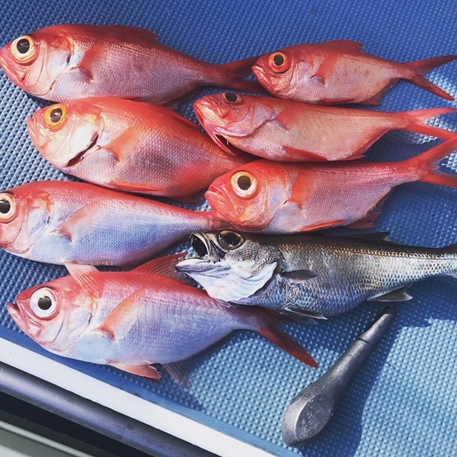 ポイントまでは40分、水深は200m前後とキンメダイ狙いにしては港からとても近いポイントでした!仕掛けは糸とムツ鈎だけのシンプルな胴突き仕掛けに、サバの皮を薄くそいだ短冊をチョン掛けするだけです。マグネットに針を並べて、船長の合図でミヨシ側の人から順番に投入していき、底から5mオモリをきってアタリを待ちます。1投目からアタリがありクロシビカマスが釣れてきました!船中でもすぐにキンメダイがあがり始め、5投目にようやく自分にもキンメダイが3連でヒットしてくれました。その後はサバの猛攻でなかなか仕掛けがタナに落ちて行かなかったり苦戦させられましたが、メダイやクロムツが混じって釣れてきます。290mのポイントに大きく移動しサバから逃げ切ってからは4匹追加でき、トータルでキンメダイを7匹釣る事が出来ました!
