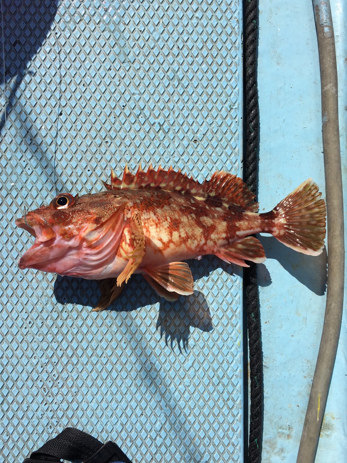 絶好の釣り日和でいざ沖へ出発!ポイントは水深約60mで釣り開始。開始早々に、数少ないマイワシを使い一人だけ大物を狙うも不発。カタクチでもアタリは多くありますが、魚が小さいのか?針に掛からない。しかも、鱗だけキレイに取られ一体何者の仕業だろう…。釣れてくるのは、ガシラ、チカメキントキ、小型のマハタが目立ちスーパービッグは現れませんでしたが当たりが多い釣りって楽しいですねーー。