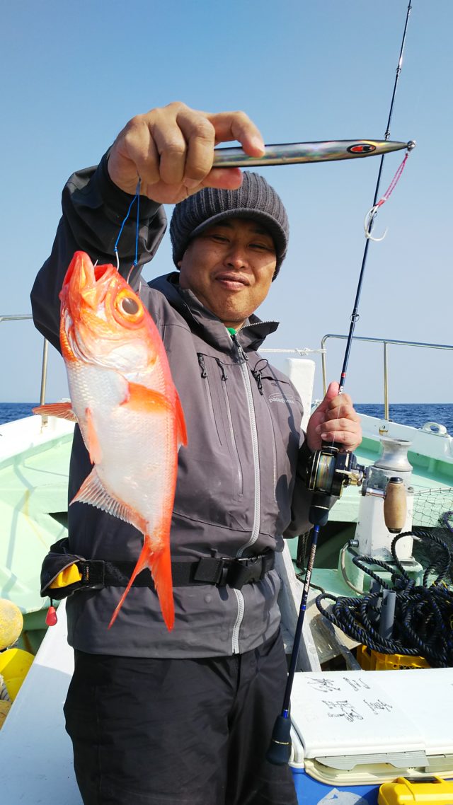 これぞ春!というような上凪!!に久々に当りました。今回の狙いは、「キンメダイ」。ここの所連日好釣果が各船から聞こえてくるので、チャレンジしてきました。ポイントとしてはクロムツをやるところよりやや深め。水深250m~300m強といった所。「ハイ、どうぞ~」の合図でジグを落とす。着底までしばしの時間・・・着底後ワンアクション。スーーッとゆーっくり持ち上げる感じのジャーク。そして落とす。〝ピタッ″と糸が止まる綺麗なアタリ!しっかり糸フケを取ってからフッキング。魚の暴れるのが伝わってくるので慎重にリーリングを開始。中層でバラさないようにと船の揺れを躱しながら寄せてくると、バッチリ狙いのキンメダイ!幸先の良いスタート。次の流しでもヒット!これもキンメ。同船されてた方々も次々にヒットし船中全員ヒットが数回おこるという釣れっぷり!船長よりさらなる深場へ誘われ400m強のポイントへ!ここでは大型のキンメが釣れているのと、うまくすると「アコウ鯛」が出るとの事。さらに重いジグに替えいざ!さすがにさっきまでとは100m以上違うので着底までの時間が長い。着底後ロングジャーク&フォール、リーリングはワンピッチ、ツーピッチ、ハーフピッチ、1/4とさまざまな組み合わせで誘っていると何やらヒット!かなりの重量。200m程巻いてきても今一引きが弱い・・・「本命ではないなぁ~」と思いながらも残りを巻き続け、結局上がったのは先程まで釣っていたのよりややサイズの下がるキンメでした。私のファイトの途中で横でヒットしたWeb店の村木君はまだまだ上がってこないどころかドラグを出されている・・・一目でデカイのが掛っているのが解る。辛抱のファイトが続くが残り100m程となった頃となりの人とライントラブル・・・ラインを掴むと異常に軽い「これって・・・本命やな」気付いた私と顔を見合わせた船長も気付いた様子。見事!赤提灯が水面に浮かんだ。デカイ!!無事船内に上がったのは60cm3kg超のアコウ鯛!さらに続けて艫の乗合の人にも同型がヒット!キンメはいつまで釣れるか解りませんがチャンスがあれば又行きたいです。それにしてもアコウ鯛は迫力がありますね~!!