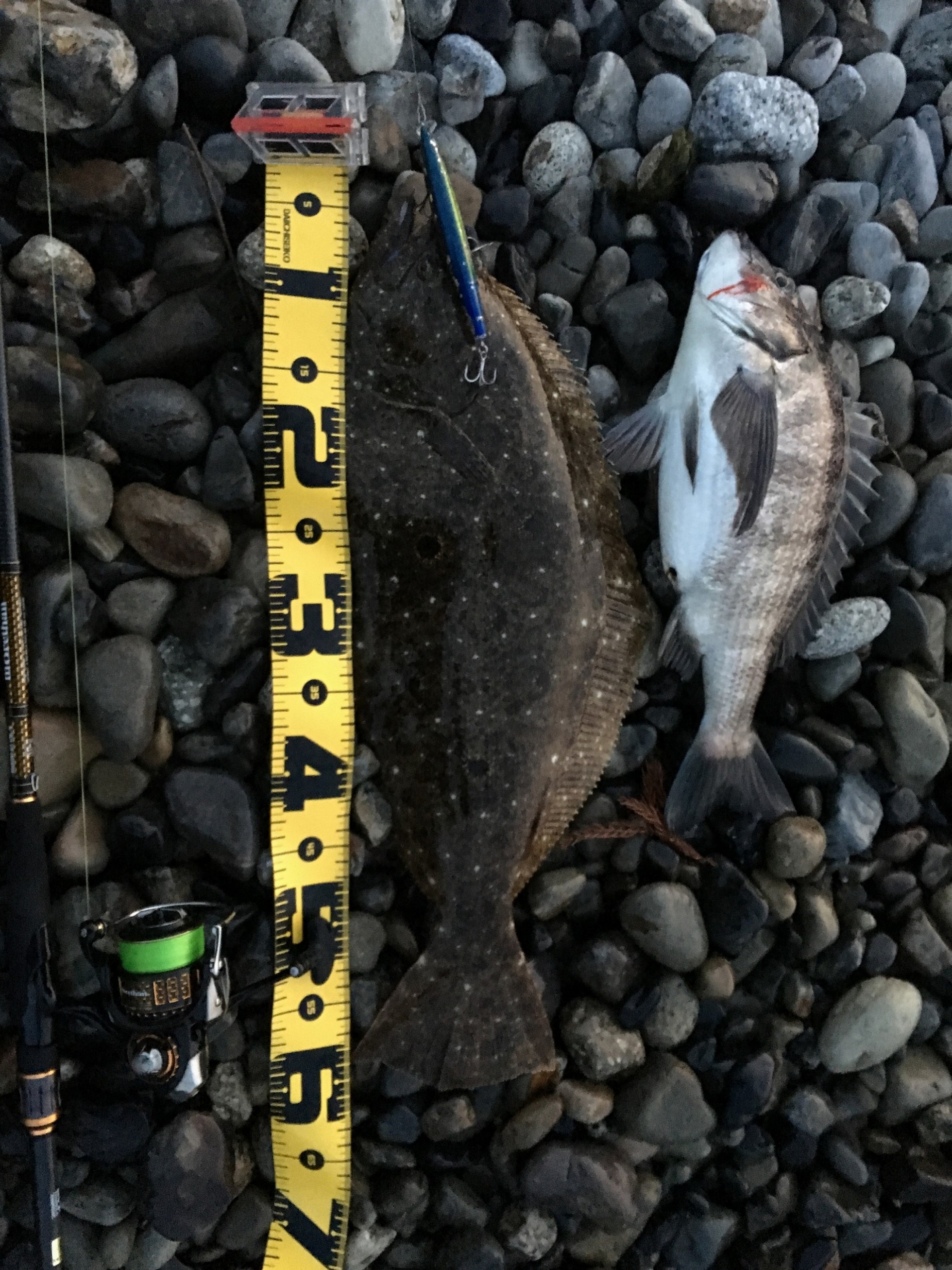 良い感じに川から海へ流れ出していて、波打ち際にベイトも見られます。川の流れに乗せミディアムリトリーブで来ました!!ヒラメ60cmそのあと同じパターンでチヌも追加!!HITルアーは(シマノ サイレントアサシン120F)このエリアは海藻が多く根も多い為、ボトムを狙うのは厳しかったです。フローティングミノーが大活躍でした。引本浦周辺は今調子良さそうです!!みなさんも是非出かけて見て下さい。