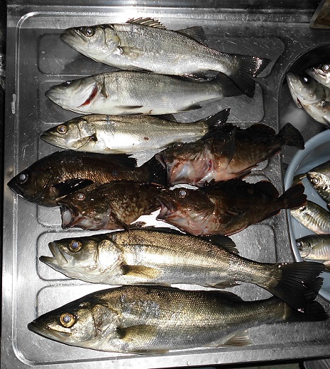 一晩目で状況が良くないのがわかったので丁寧に魚を探して行く。まずは夕暮れからアジを狙う、反応無し。暗くなって来た頃にアタリはあったが掛からなかった、サビキでも4匹しか釣れていないなか ヒット!連発するも3匹でアタリが止まる。移動、次は今回の本命キス狙いだがアブ アジ832を使いライトラインで遠投!ナイスサイズの魚が掛かるがバレ、そのまま探るとカサゴが3匹釣れて やっとキスが釣れる。そしてキビレがヒット!掛ければロングロッドは楽です。移動してアジを探すと居ました!ポツポツ追加していると重い魚がヒット!上がって来たのはメバル!次の場所へ行きアジを1匹追加してもう一度セイゴ狙いへ、やはり難しい状況はかわらず5匹釣るのがやっと。しかし40㌢のセイゴが釣れました。