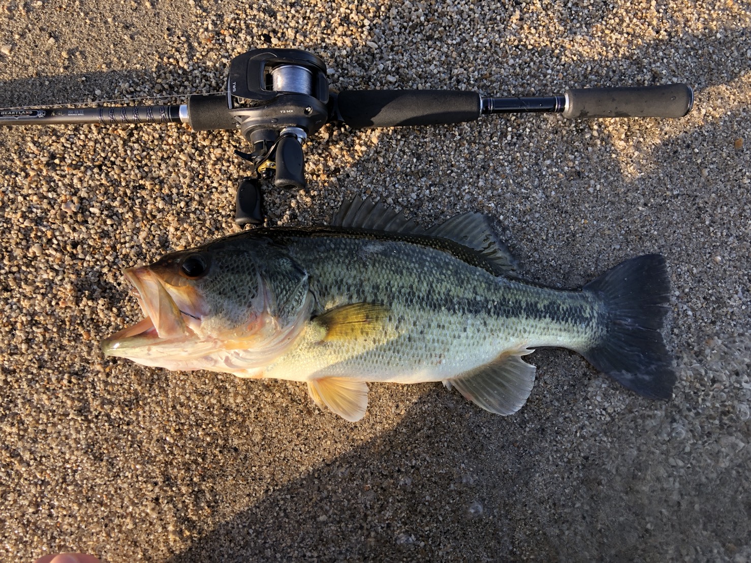 少し北を見ていつもの南湖西岸へ、何となく今日は最近投げているザリバイブを封印し前のポイントでリグっていたヘビキャロ。ワームをスーパースティックから飛距離無視のギルフラットに。すると一投目でアタリがありフッキングするもすっぽ抜け。