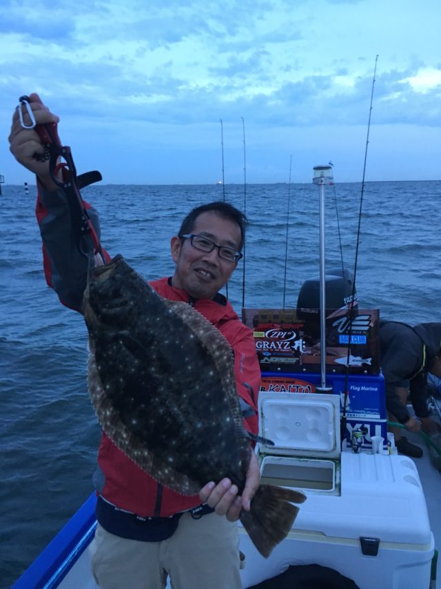 前半戦は残念ながら南風のせいで底荒れし当たりがほとんど無い状況・・・暗くなりかけた時、早川さんに押さえるような当たりが!強烈な引きを楽しそうに味わいながら上って来たのは、何と50アップのヒラメでした。場所は、川越火力の沖50m程の場所こんな所にヒラメがいるとはビックリでした。
