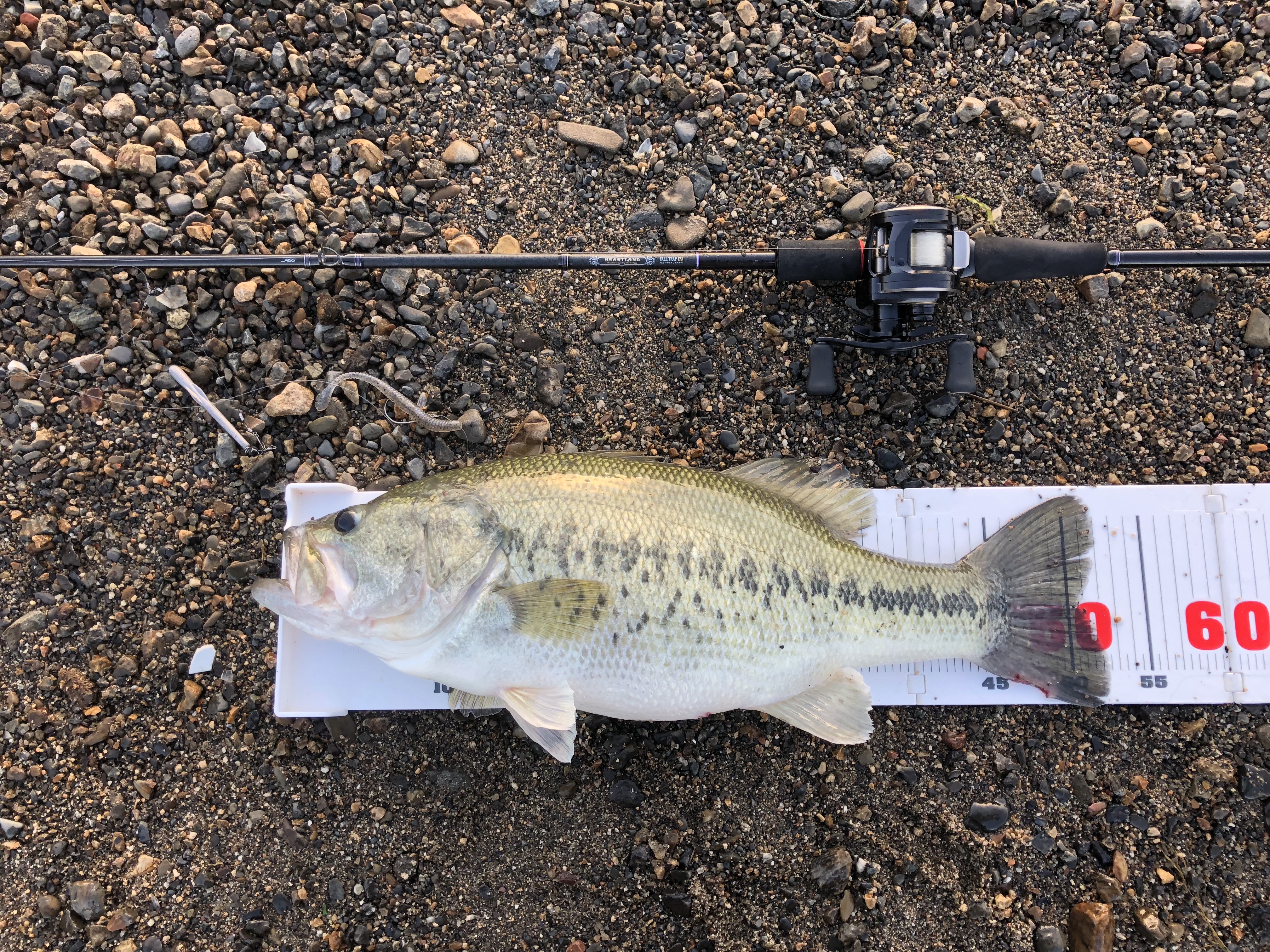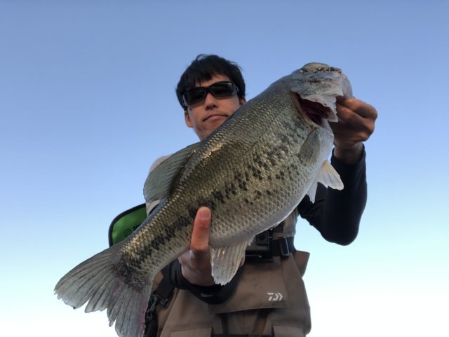 ポツポツと人がいて、入れそうなところで良さそうなポイントを探し、入ると一投目でコンっとアタリ!!合わせるとすぐ跳ねたので”40くらいかな”っと寄せると意外と引く。手前に寄せてくると50アップではないですか!!前回の魚が強烈すぎてすんなりあげちゃったヨwちなみにプリスポーンのバスでした。やっぱりスパテラ5インチ はえさですわ!ヘビキャロ、テクニカルシャフトで投げるのが気持ち良すぎます!!あーロクマルまた釣りたいなぁ〜