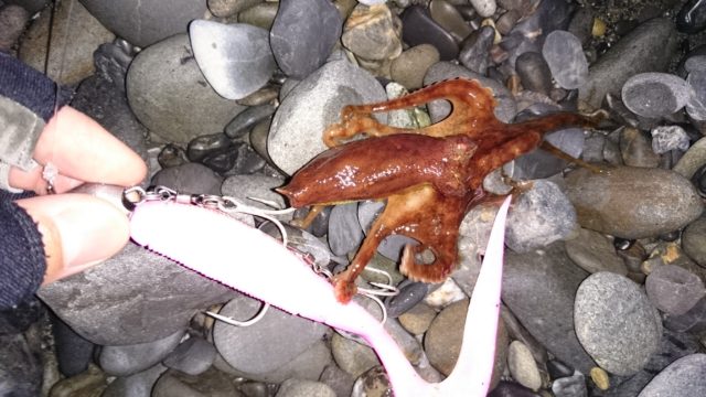 前日の夕方の鳥山を期待してサーフに入りました。波足は長いですが、ベタ凪、無風で釣り易い状況でした。しかし、ベイトっ気は無く、鳥山も潮目も無しと雰囲気がありません。とりあえず、ワームを選択してリフト&フォールで誘って行きますが反応を得られません。結局、ブレイクでミニサイズのタコが引っ掛かっただけで終わりました。またリベンジします。