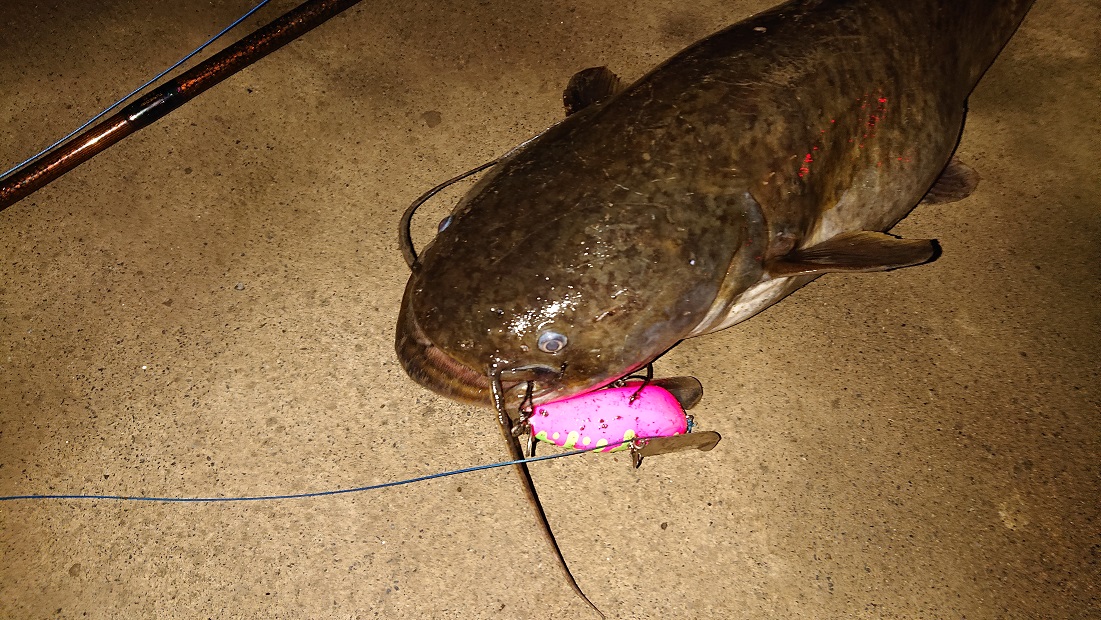 河川でナマズの居そうなポイントにトッププラグを投げながら探っていると、流れ込みと水草とストラクチャーが隣接するポイントがありポンパドールjr鯰カスタムを引いていると、ジュボ!っとバイトがありヒットしました、抜き上げるとかなり重くて、70cmちょっとの大型ナマズでした。その後もランガンしていると一度バイトはありましたが掛からず終了となりました。