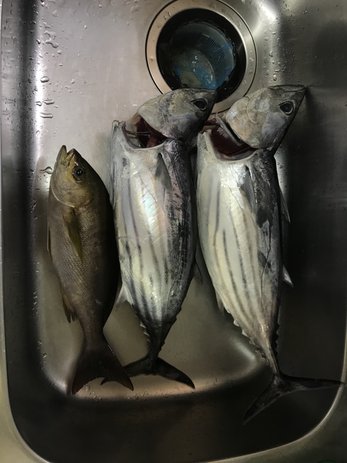 その後、移動したのは、水深50m〜60mライン、到着一投目で、同船者の方にカツオがヒット!自分も続く様に、ジグを50gのチビウロコにチェンジし、カツオがヒット!ライトタックルでのやり取りを楽しみながら上げて来ると、丸々したいいカツオでした笑その後は、カツオをもう一本と本命のイサキが一匹と少ない釣果でしたが大満足の釣行となりました!