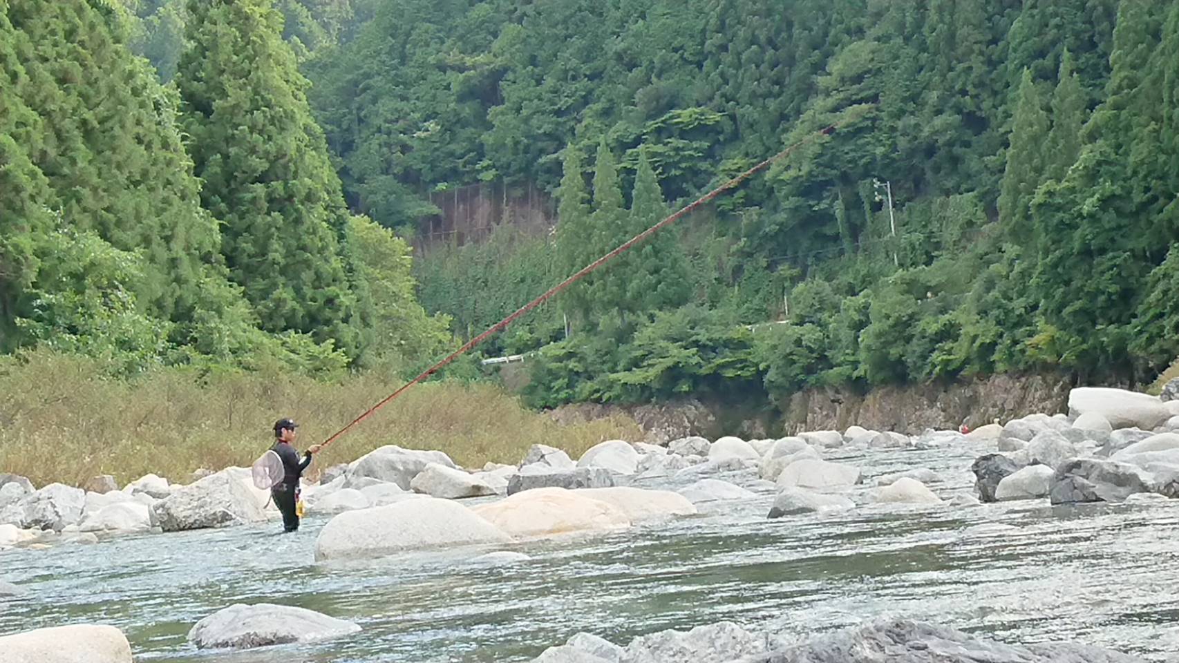 道中、板取川中流域もかなり川の地形が変わっている所ありました。いつも行く上流ポイントも、やっと数日前に濁りがとれ、川を見る感じだと、透明感もあり、いつもの板取川上流に戻りましたが、川の筋はかなり変わってしまっていました。14時半頃に釣り開始。30分くらいで最初の1匹かかりました。