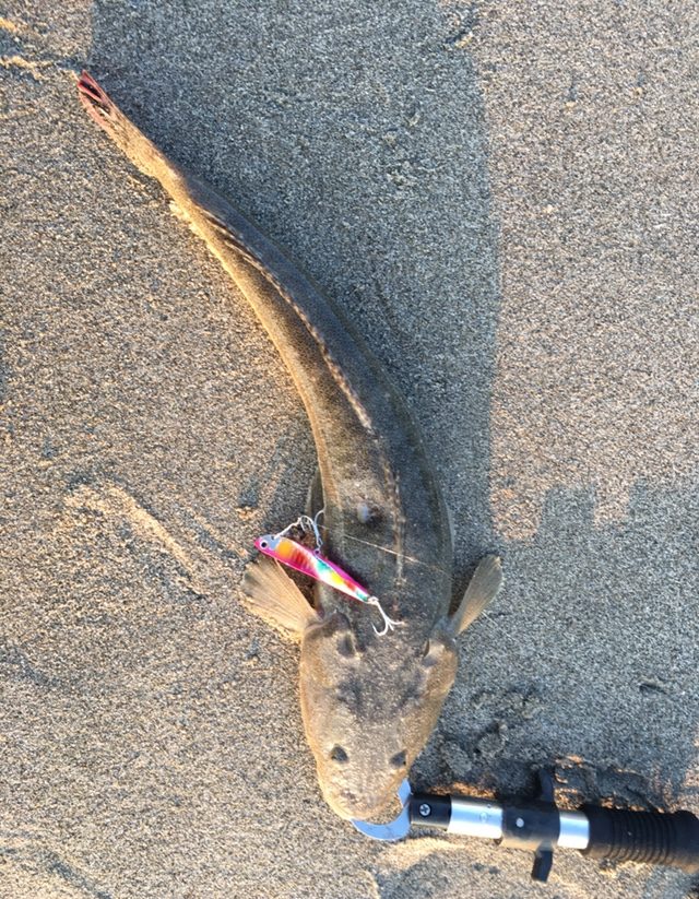 前日にフラットフィッシュの釣果情報をたくさんいただいていたので、それを確かめに早朝に表浜の海岸に行ってまいりました!情報がすでに回っていたのか、ポイントに到着するとすでに沢山の人がルアーを投げていました。入れる所に入って、まずはワームを投げてみましたが反応なし。その後、ワームからメタルジグ"飛びすぎダニエル"のゴールドレインボー30グラムに替えて、動ける範囲でランガンする事にしました。移動した場所で、60mほど先のブレイク付近めがけてキャストし、ボトムを取るためテンションフォールをさせていると、ゴンッ!というアタリが!すかさず合わせると、グゥーと強く引っ張られました。不思議な引きだったのでなんだろうと思いながらあげてみると、背がかりの45センチほどのマゴチでした!今シーズン初のサーフでしたが、いきなり釣る事が出来たので期待が出来そうですね!ただ、とにかく暑い・・・。