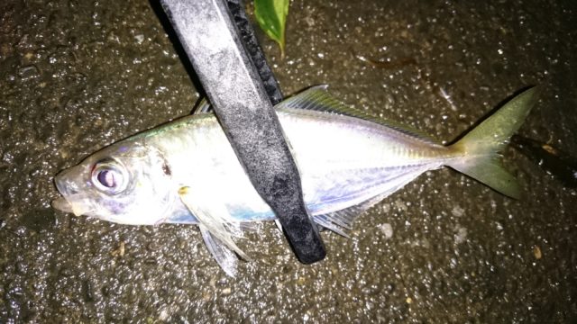 仕事帰りにアジングに行って来ました。台風後の豪雨に見舞われ雨模様。とりあえずポイントに着くと運良く雲の切れ目なのか晴れていました。アジメバアーミージグヘッド0.4gにチビキャロスワンプをセッティング。切れ藻などのゴミの間を誘ってきます。カウント5でアクションして来るとヒット!大きさは14cm前後でした。潮は濁っていましたが、クリア系のカラーで良くアタリます。6匹釣ったところで豪雨になり、雨が上がりそうも無いので納竿しました。30分程の釣行でしたが、釣れたので良かったです。