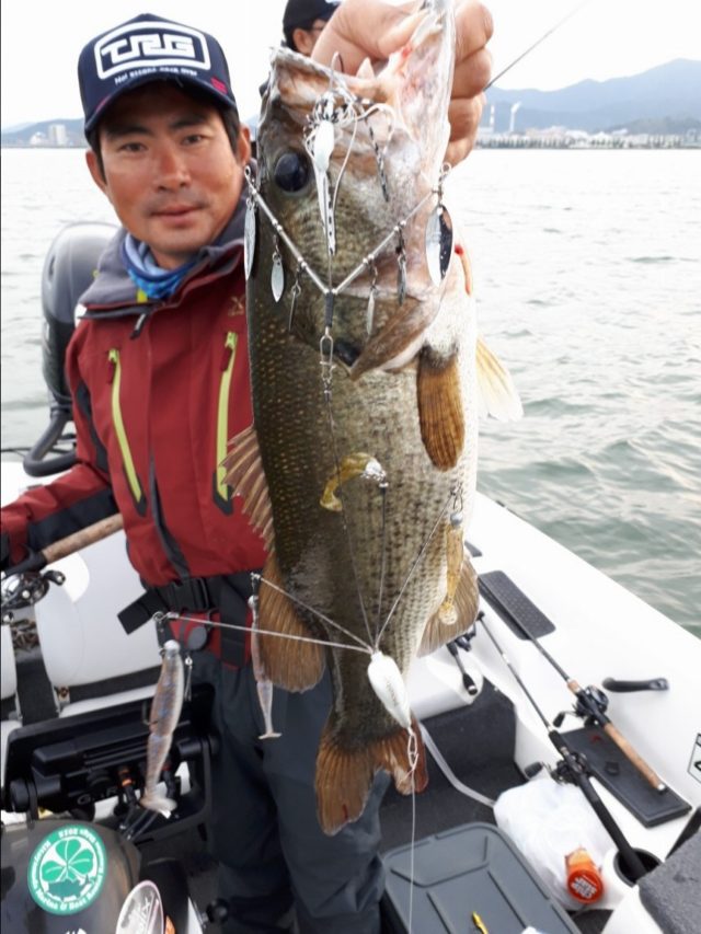 釣れないので11時頃にチ ョッと早め昼食を食べに行きました。バスボートを桟橋にくくりつけてホテルの食堂でランチを食べました、一時間ほど休憩して気を入れ換えて北のポイントへボートを走らせました。琵琶湖大橋をくぐり抜け北湖に行くのか思いきや島の回りで魚探にいい反応が出たため水深10mで鉄板バイブやダウンショットなどで狙っていくと、この日初のアタリが自分の竿に来ました。 ダウンショットでトントンせずに底に鉛をズルズル引くような釣り方が良かったです。ワームはO.S.Pのドライブカーリー4.5インチが良かったです鉛は10gで鉛から25cmの所に直接アジ針12号を結びワームはチョン掛けでした。ポイントを変えてもこの日はこれが良かったです。最後ポイントでアラバマ投げていた人に50cmの良いサイズがヒットしこの日は終わりました。やはりアラバマ釣れます❗