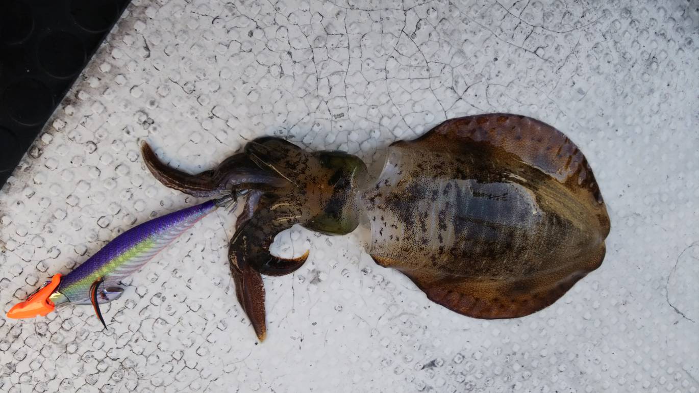 あるポイントでは濁りもウネリもなく釣れそう、良い角度でラインが入るがアオリイカの反応は悪い。となりの方がアオリイカが水面近くまでついてきたとのこと。その時私にアタリ・・・リールのドラグが緩すぎて針掛させられないという初歩的ミス・・・そんなこんなでアタリはあるがなぜか?乗らない、確実にアオリイカなのだが・・・結局アオリイカの顔は見る事ができたが10打数1安打という散々な結果。