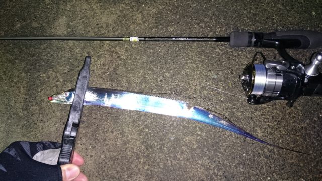 空き時間があったので常夜灯周りをアジングラン&ガンです。向かい風+常夜灯のポイントでセイゴがボイルしているところがあったのでやってみました。ワームはチビキャロスワンプです。カウント5で誘って来るとヒット!セイゴじゃなくタチウオでした。指1.5本ってとこでしょうか。その後は続かなく納竿しました。