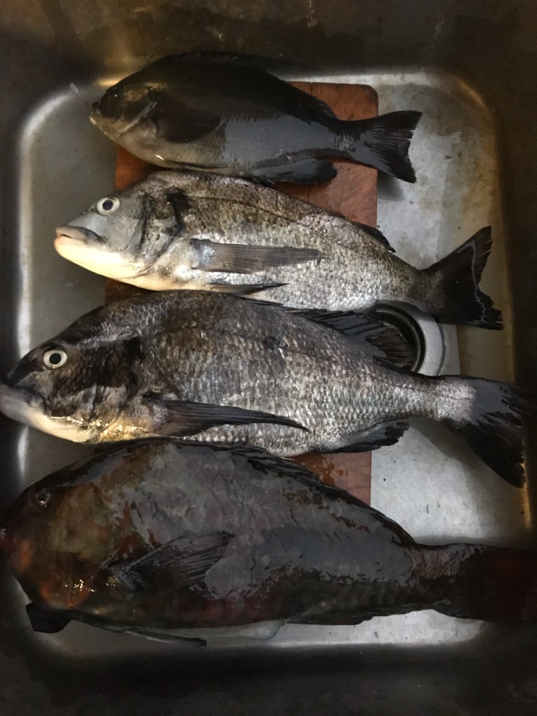 風が止んだ間だけ北側に仕掛けが入れる事ができ、25cmクラスのグレにチヌとブダイが顔を見せてくれました。グレは掛かるもののコッパばかりで検量に持ち帰ったのは1枚のみとなりました。