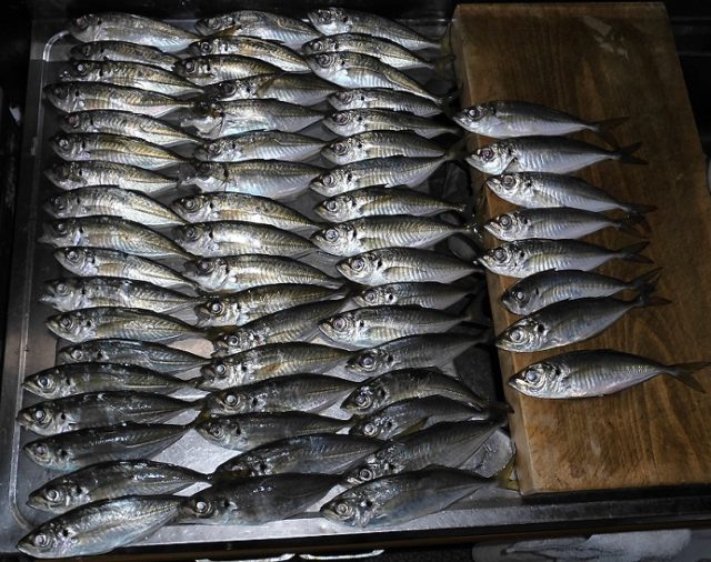昼間漁港でワームを投げてみるもチビカサゴ2匹とフグにワームをやられ即止め。夕暮れからポイントに入るが隣にサビキおじさんが、即移動して軽くセイゴの様子を見て10匹ほど掛かってくれたので即移動してアジ探しへ、前夜キッカケはつかんでいるのでジグ単でどう攻略していくか!付き場はなんとなくこの辺でしょ!と投げると比較的簡単にアジが5匹ほど釣れるが沈黙、こりゃ魚の群れが離れたな、通常皆さんがやる着水からのラインを出して底を取る行動を私はやりませんので今回はラインを出して出来るだけジグを真下に落とすイメージでラインを竿から一気にあおって出します。そしてそれ以上出しません。フォールの後半でテンションフォールを入れ遠くの深いレンジにいるアジに送り込みます。これが当り安定してアジが追加出来ました。二晩目は44匹、もう1ヶ所見に行きましたがアタリ無しで終了です。